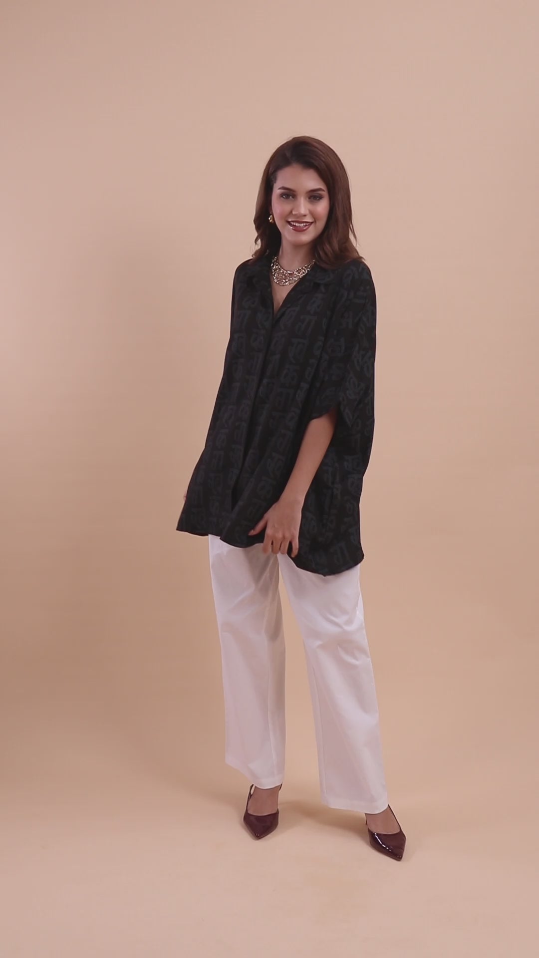 The shirt's unique design is elevated by a row of large, decorative white buttons on each side of the hem, allowing you to customize the fit or create a stylish split-hem look. With its classic collar and concealed front placket, this top is a perfect fusion of minimalist style and a unique, conversational print. Pair it with tailored trousers for a sophisticated urban look or with jeans for an elevated casual ensemble.