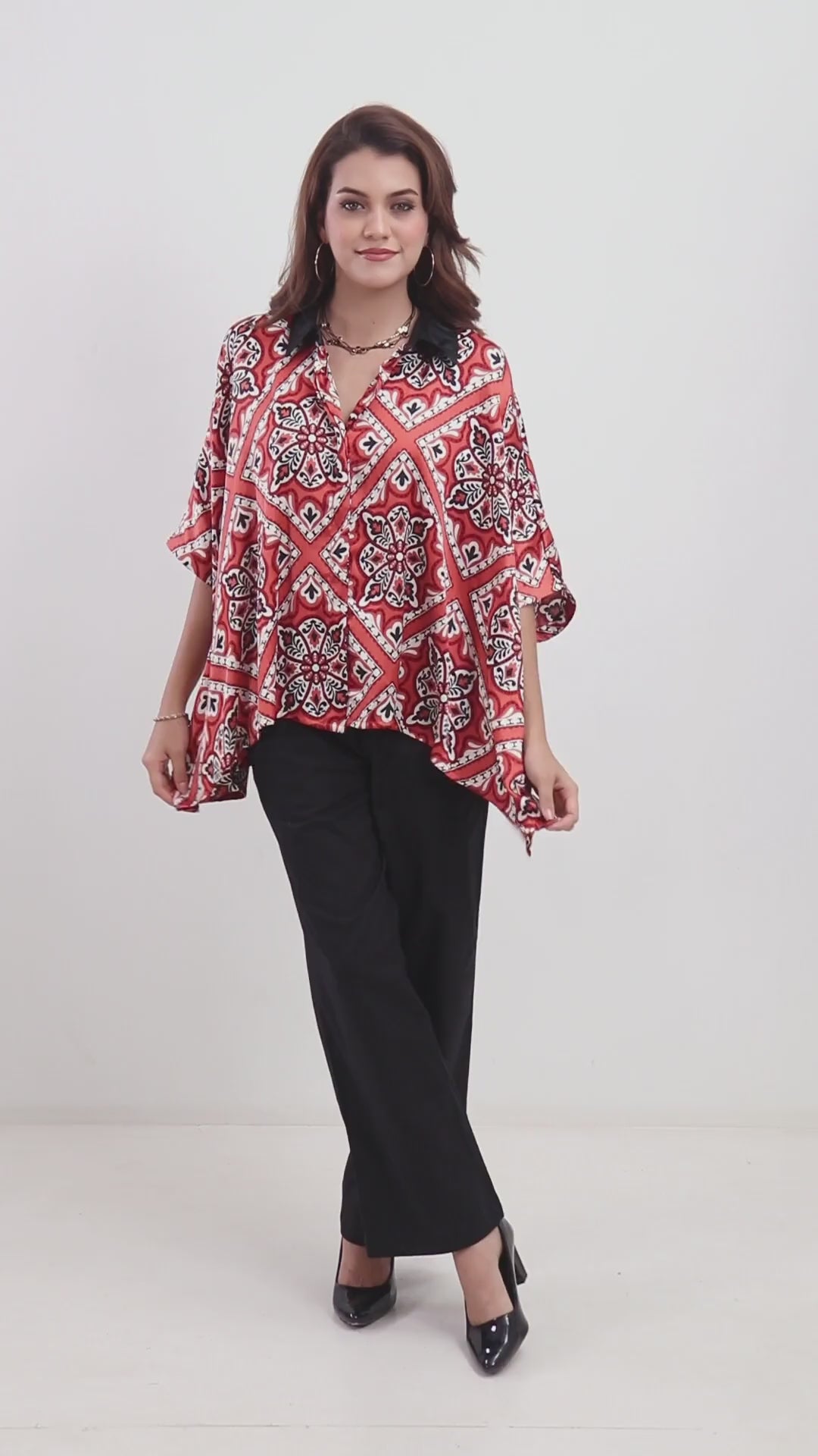 Infuse your wardrobe with rich, cultural flair with our "Tuscan Tile Print Blouse." This stunning cropped blouse features an intricate, all-over pattern in a warm terracotta red, cream, and black, reminiscent of classic Mediterranean tilework. The design is both bold and beautiful, with symmetrical floral and geometric motifs that create a striking visual impact. A contrasting black classic collar adds a modern, sophisticated edge to the vibrant print. The blouse has a relaxed, flowing fit and a short, poncho-style sleeve, ensuring a comfortable and effortlessly chic look. Crafted from a high-quality, lightweight fabric, this piece is perfect for making a statement while staying cool. Pair it with high-waisted jeans, trousers, or a skirt to let the unique print truly shine.