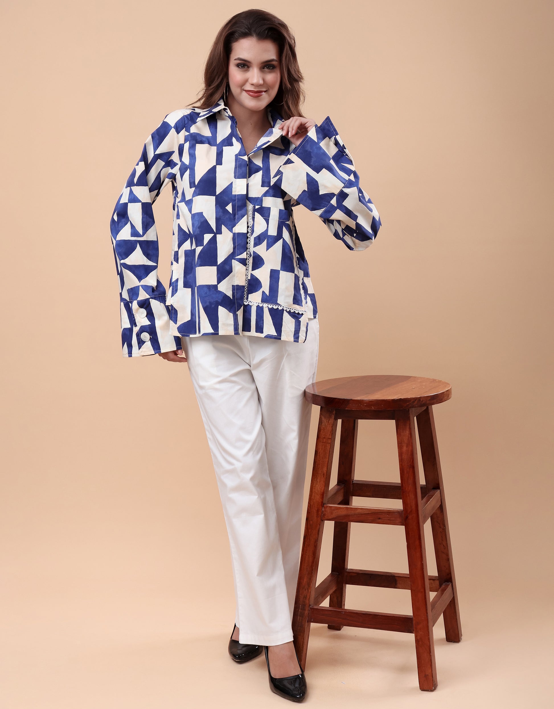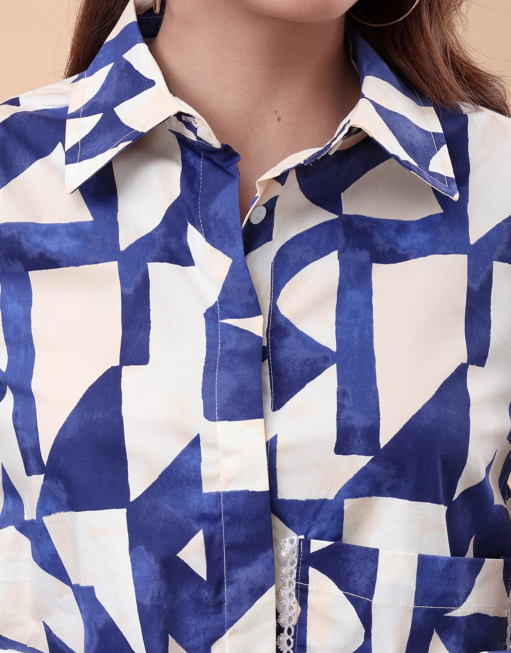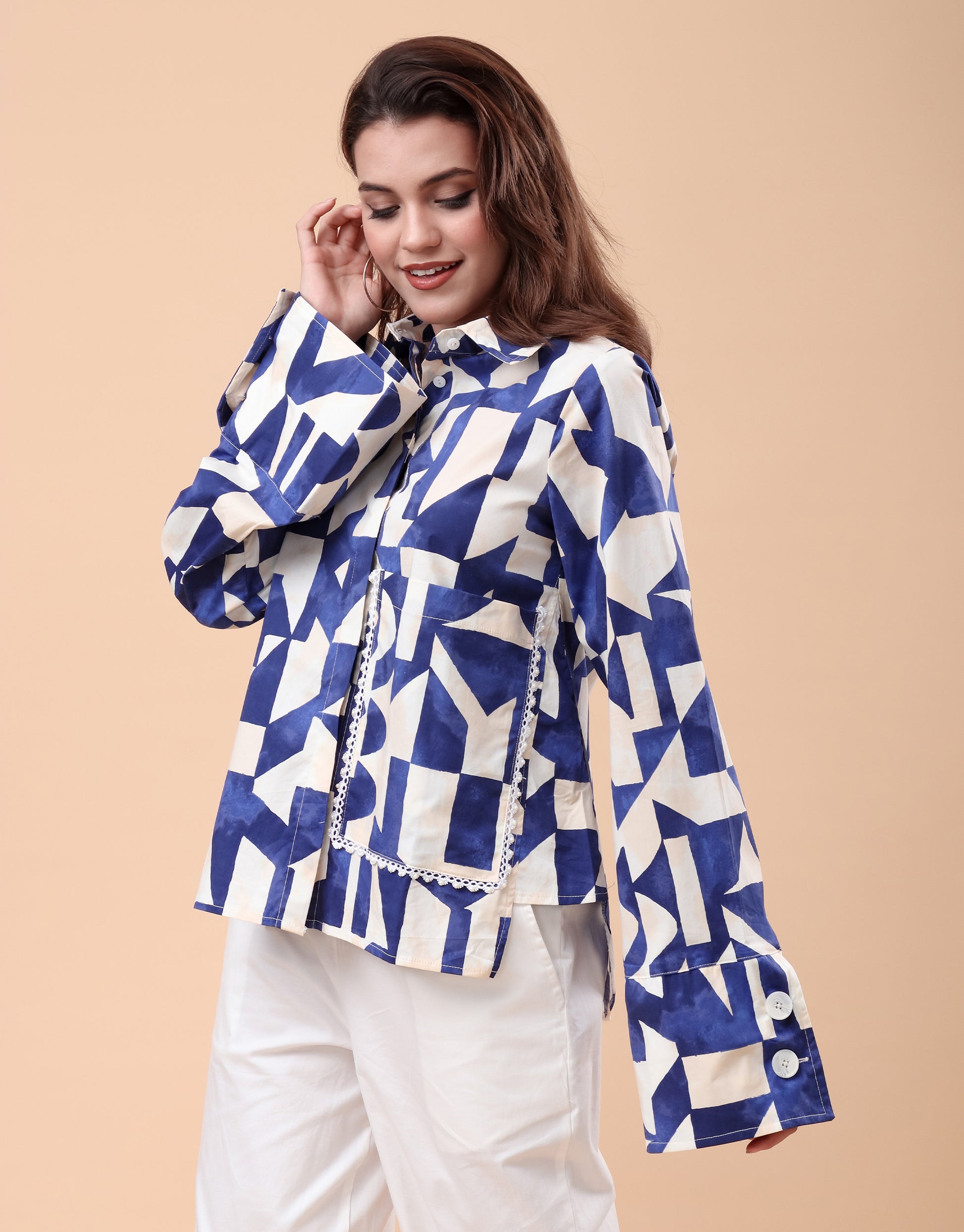 Make a bold artistic statement with our "Geometric Patchwork Print Shirt." This striking button-down blouse features a dynamic, abstract pattern in a deep indigo blue and off-white. The print's geometric shapes and patchwork-like design create a modern, contemporary feel that's sure to turn heads. A delicate white lace trim runs along the front placket, adding a subtle touch of feminine detail that beautifully contrasts with the bold print. With its classic collar and three-quarter length sleeves with a ruffled cuff, this shirt offers a stylish and comfortable fit. Crafted from a high-quality, breathable fabric, it's a versatile piece perfect for both casual and elevated occasions. Pair it with solid-colored trousers to let the print truly shine, or with jeans for a chic and effortless look.