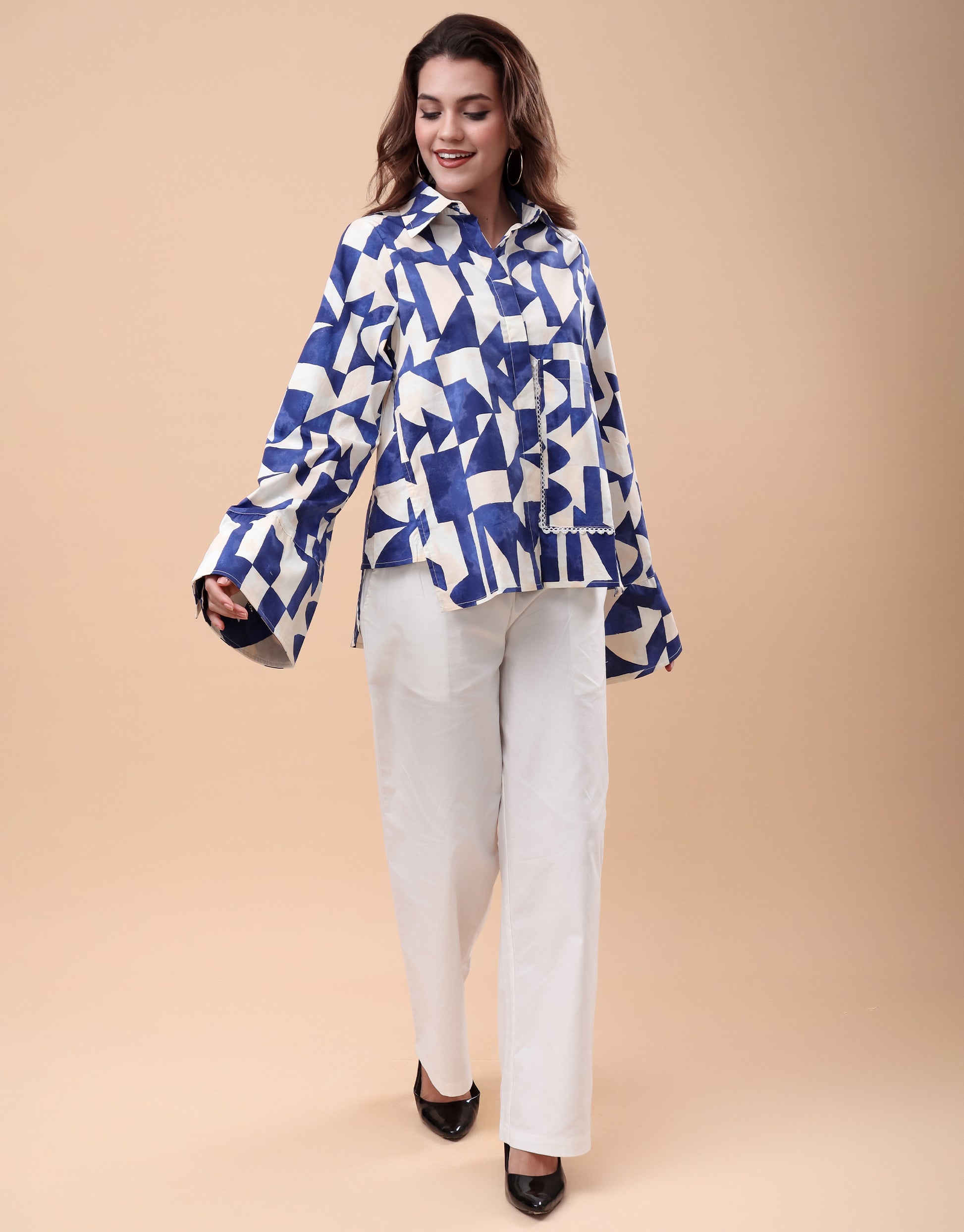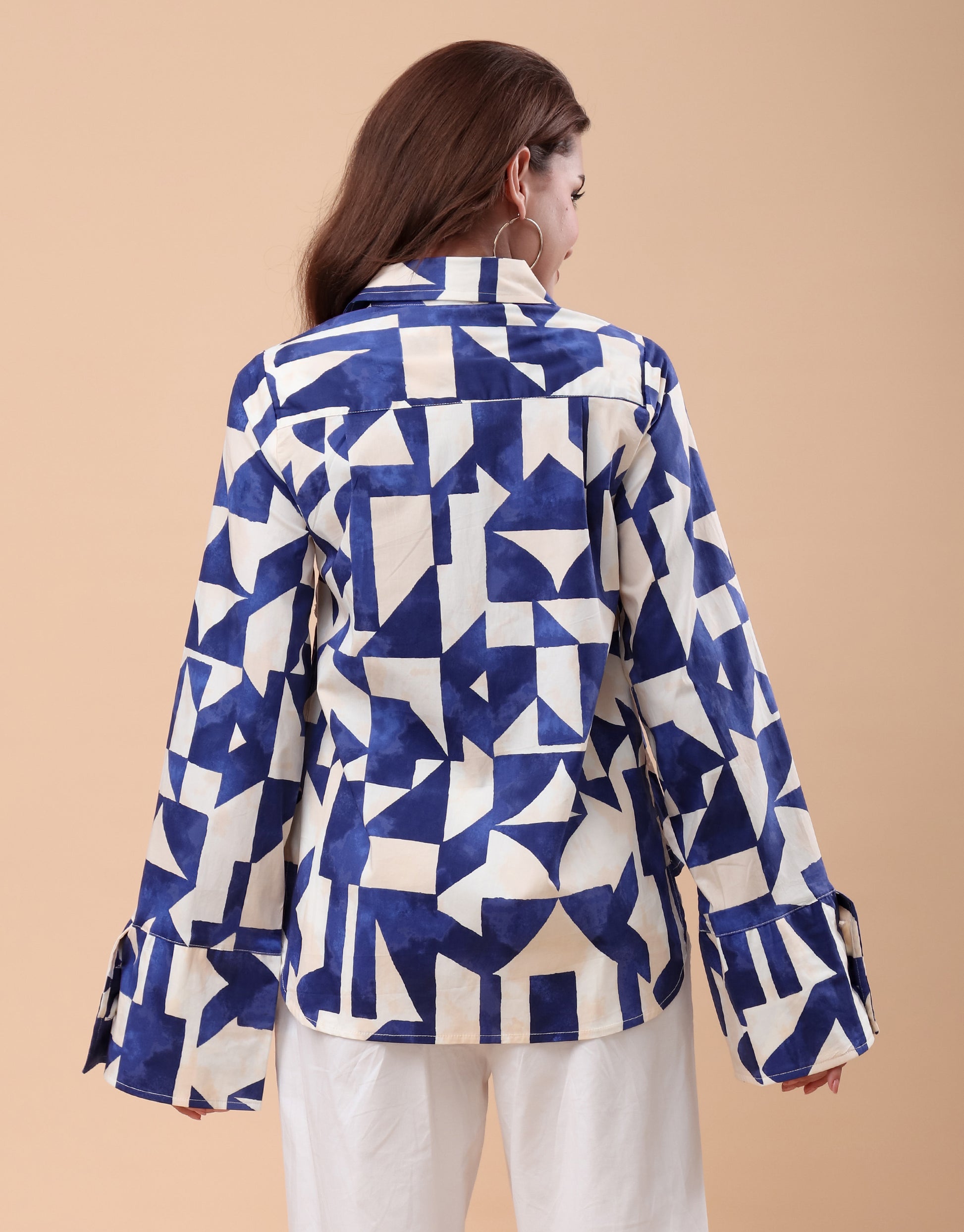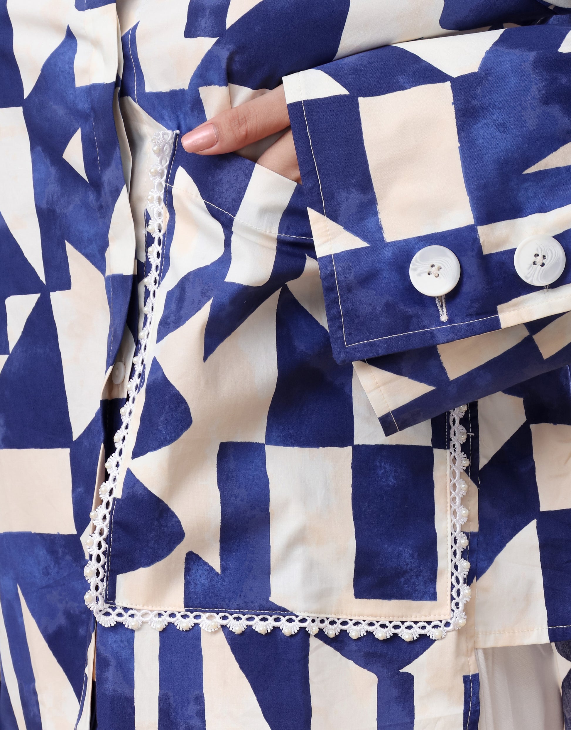 Make a bold artistic statement with our "Geometric Patchwork Print Shirt." This striking button-down blouse features a dynamic, abstract pattern in a deep indigo blue and off-white. The print's geometric shapes and patchwork-like design create a modern, contemporary feel that's sure to turn heads. A delicate white lace trim runs along the front placket, adding a subtle touch of feminine detail that beautifully contrasts with the bold print. With its classic collar and three-quarter length sleeves with a ruffled cuff, this shirt offers a stylish and comfortable fit. Crafted from a high-quality, breathable fabric, it's a versatile piece perfect for both casual and elevated occasions. Pair it with solid-colored trousers to let the print truly shine, or with jeans for a chic and effortless look.