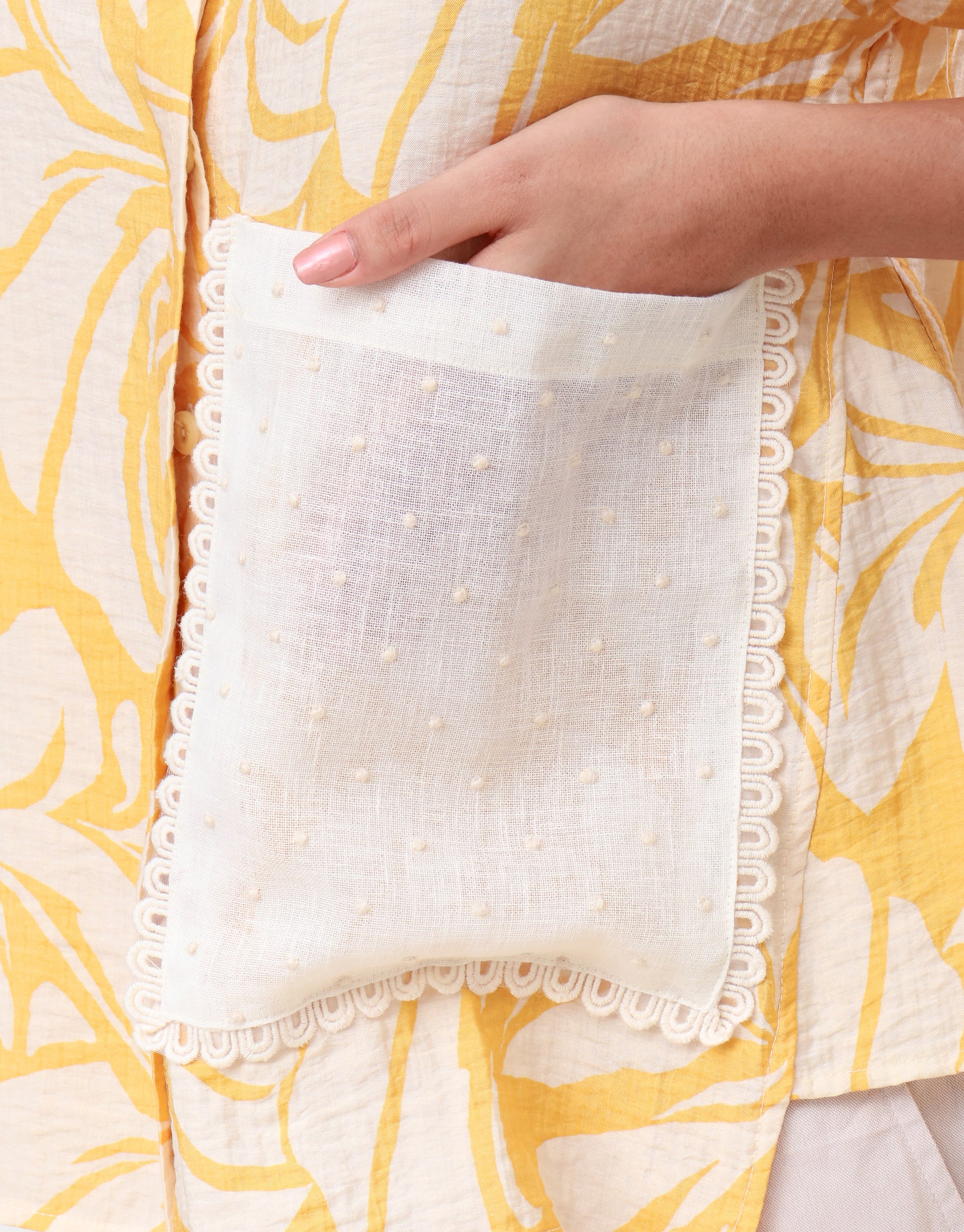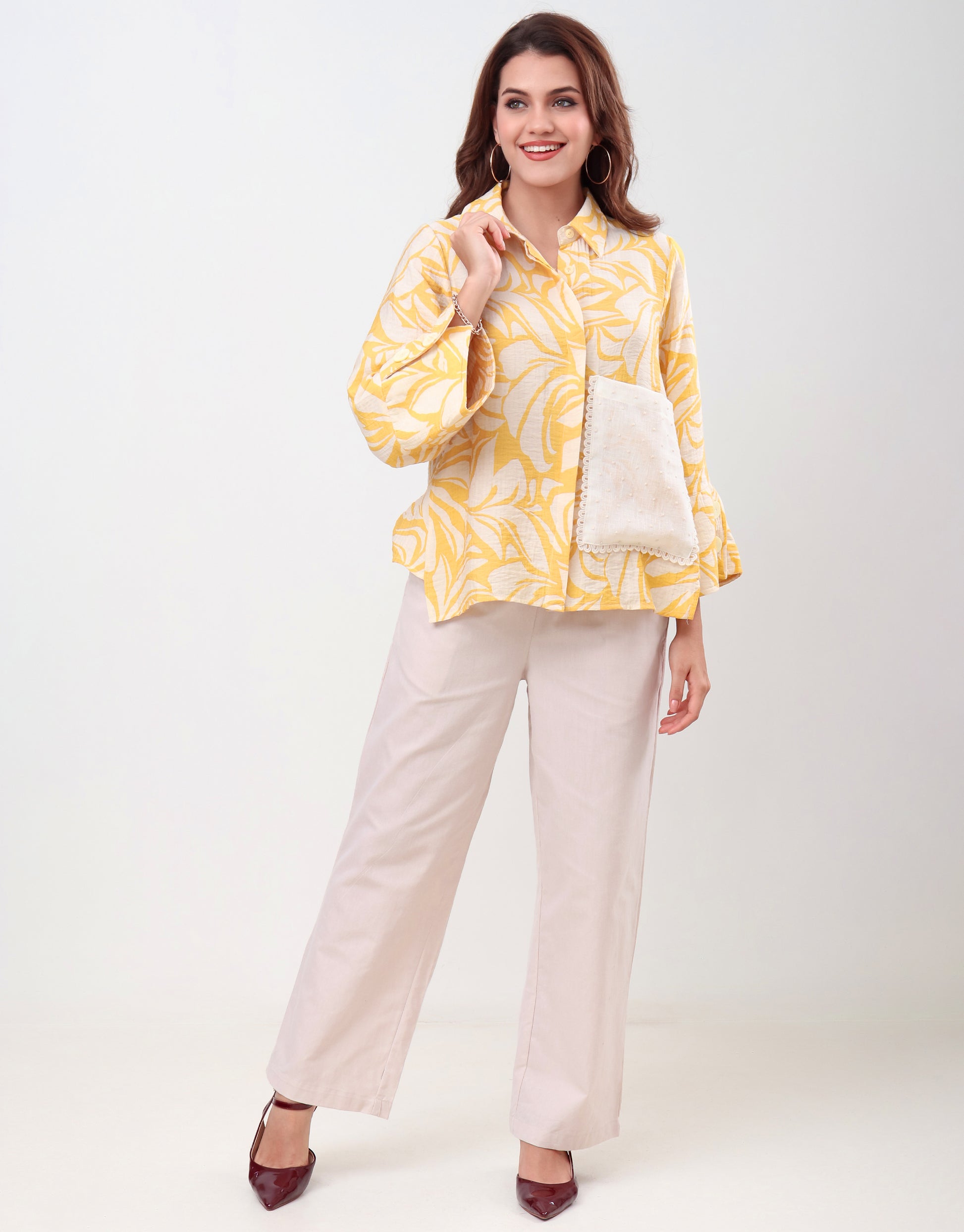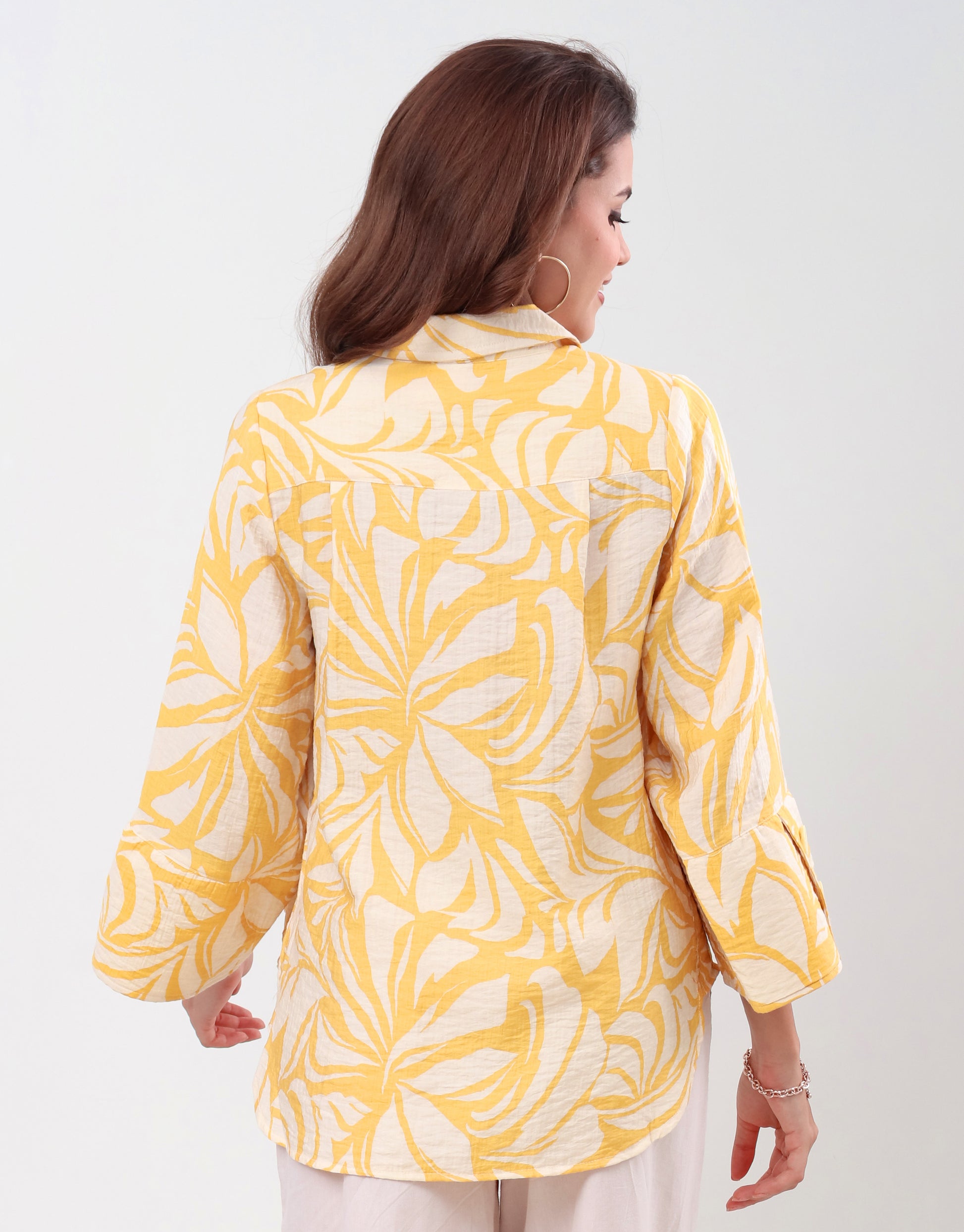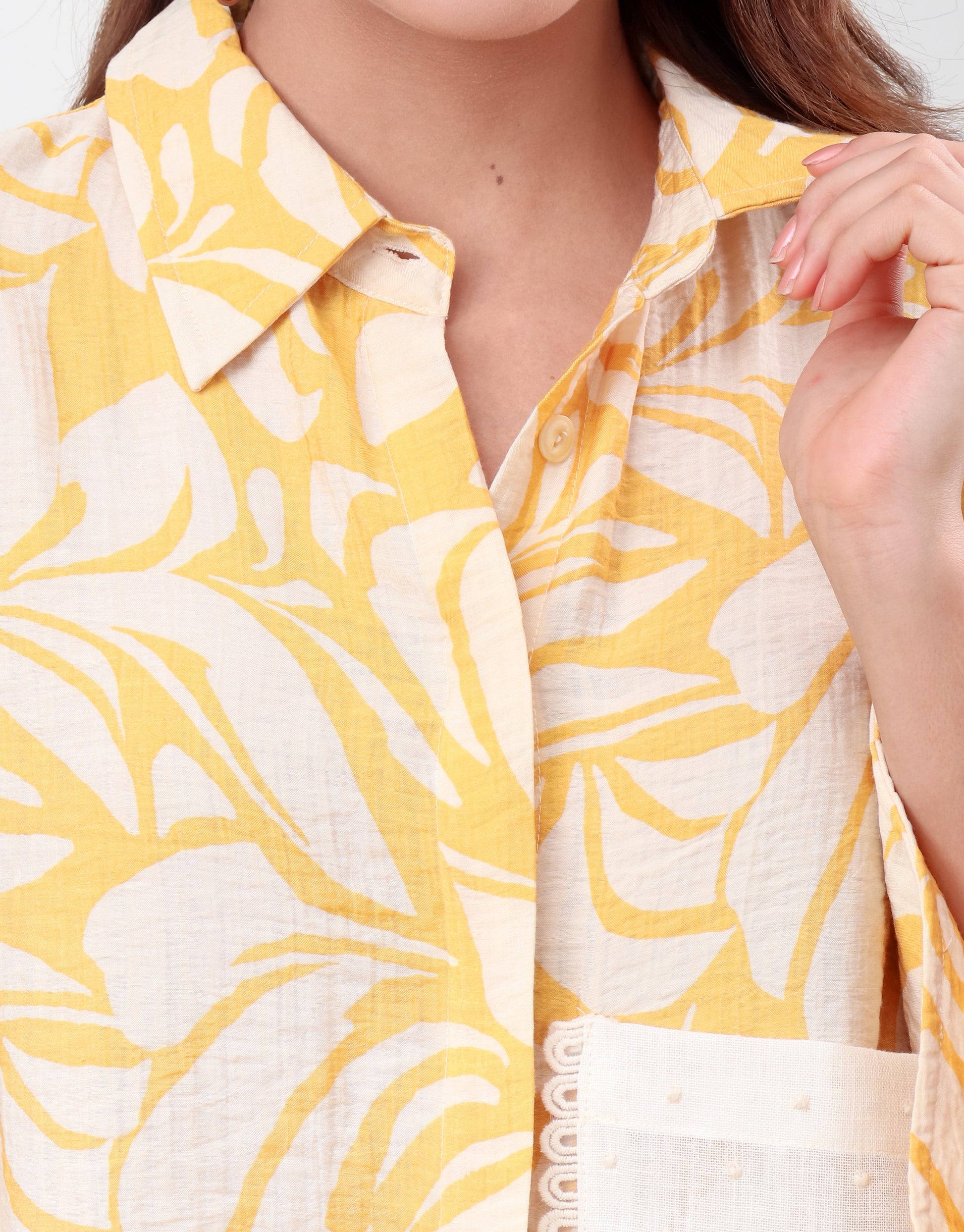 Embrace a touch of sunny elegance with our "Golden Vine Textured Shirt." This stylish button-down shirt is a true statement piece, featuring a beautiful all-over golden yellow and cream vine pattern. The fabric has a subtle crinkle texture, adding a unique tactile and visual dimension to the design. A distinctive white textured pocket on the front provides a chic and modern contrast, breaking up the pattern and adding an element of sophisticated asymmetry. With its relaxed fit, classic collar, and full-length sleeves, this versatile shirt is perfect for both casual and semi-formal occasions. Pair it with white trousers for a fresh, luminous look or with denim for a more casual-chic ensemble. This shirt is a must-have for the fashion-forward individual who appreciates unique textures and artistic flair.