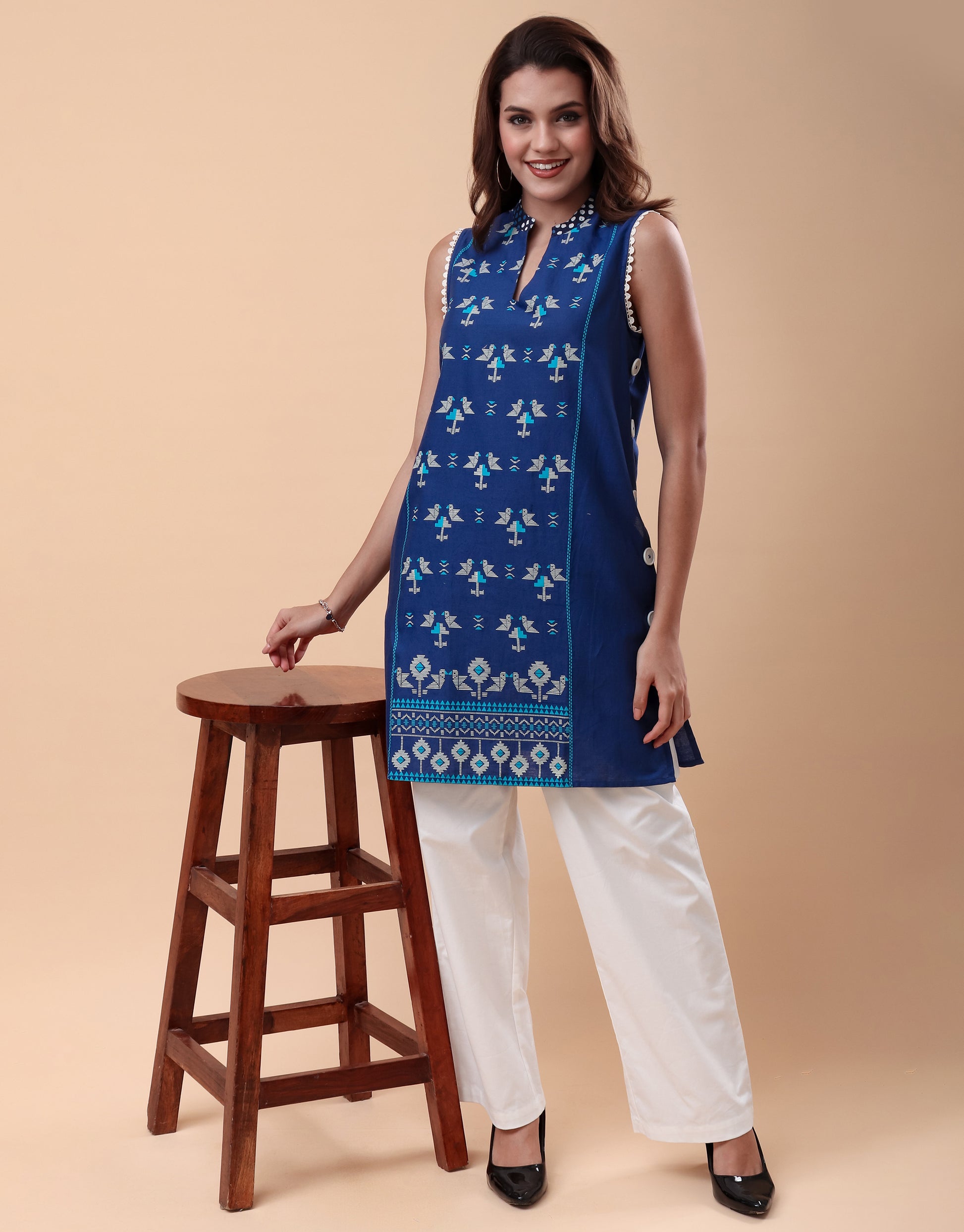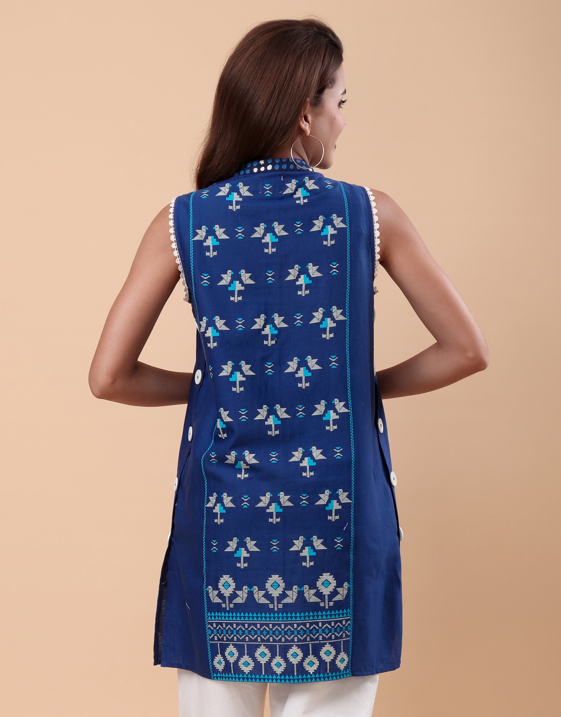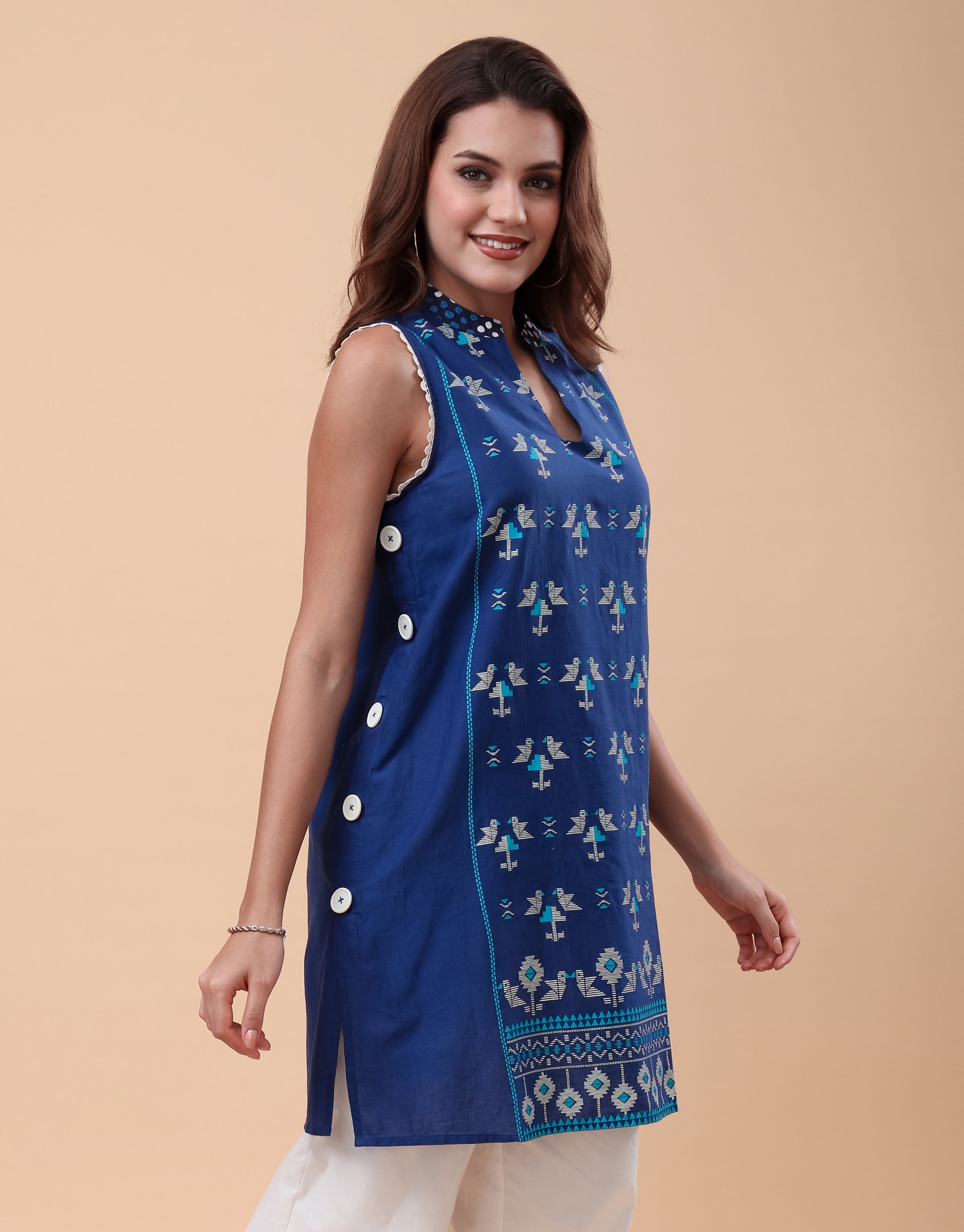Embrace a fusion of traditional craftsmanship and modern design with our "Indigo Folk Print Tunic." This stunning sleeveless tunic, in a rich indigo blue, features a beautiful folk-inspired print of geometric birds and abstract patterns in shades of white and turquoise. The high collar is detailed with a delicate white polka dot pattern, adding a playful and unique touch. The tunic has a stylish V-neck and is adorned with decorative white buttons running down both sides, adding an extra element of visual interest. Crafted from a lightweight and breathable fabric, this piece is perfect for a chic and comfortable look. Its versatile length and design make it ideal for pairing with leggings, trousers, or wearing as a standalone piece. This unique tunic is a must-have for those who appreciate artisan-inspired and ethnic-chic fashion.
