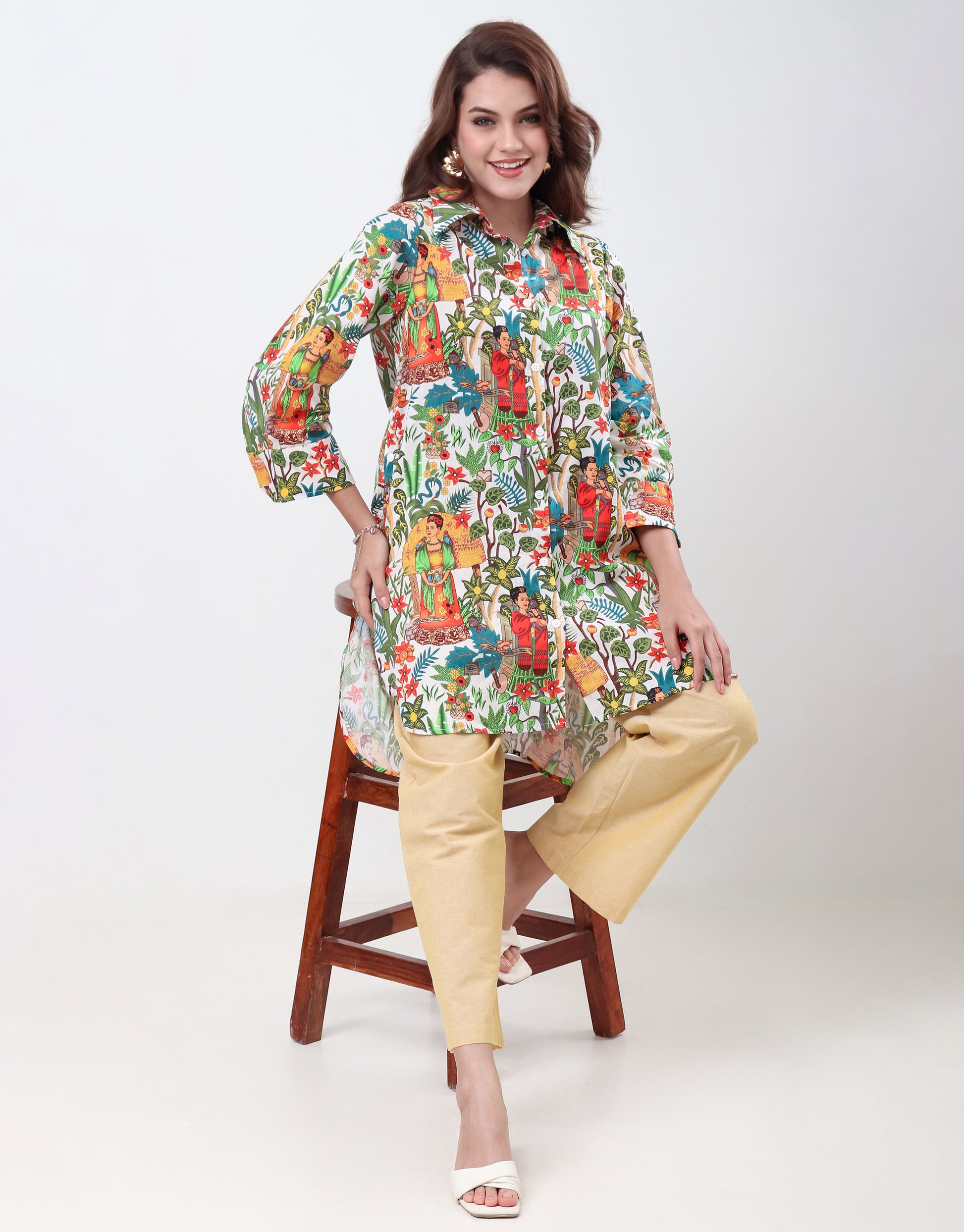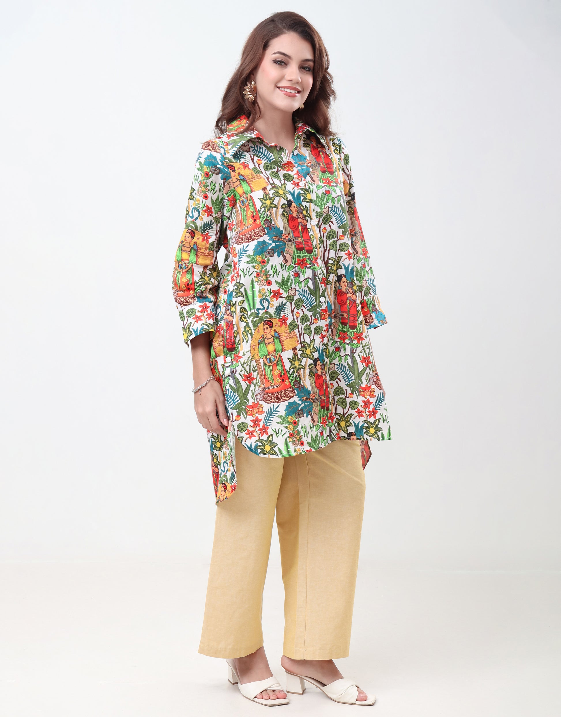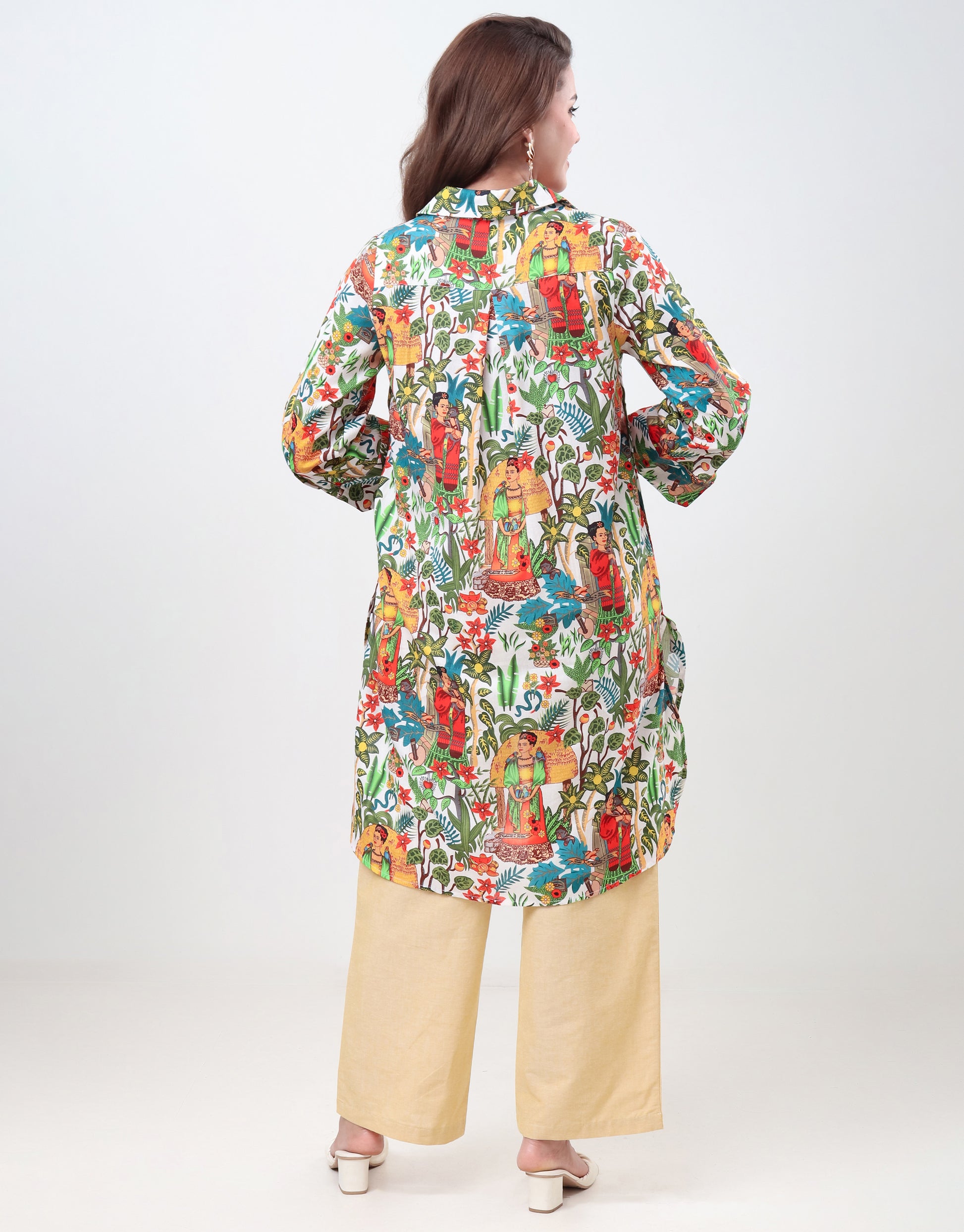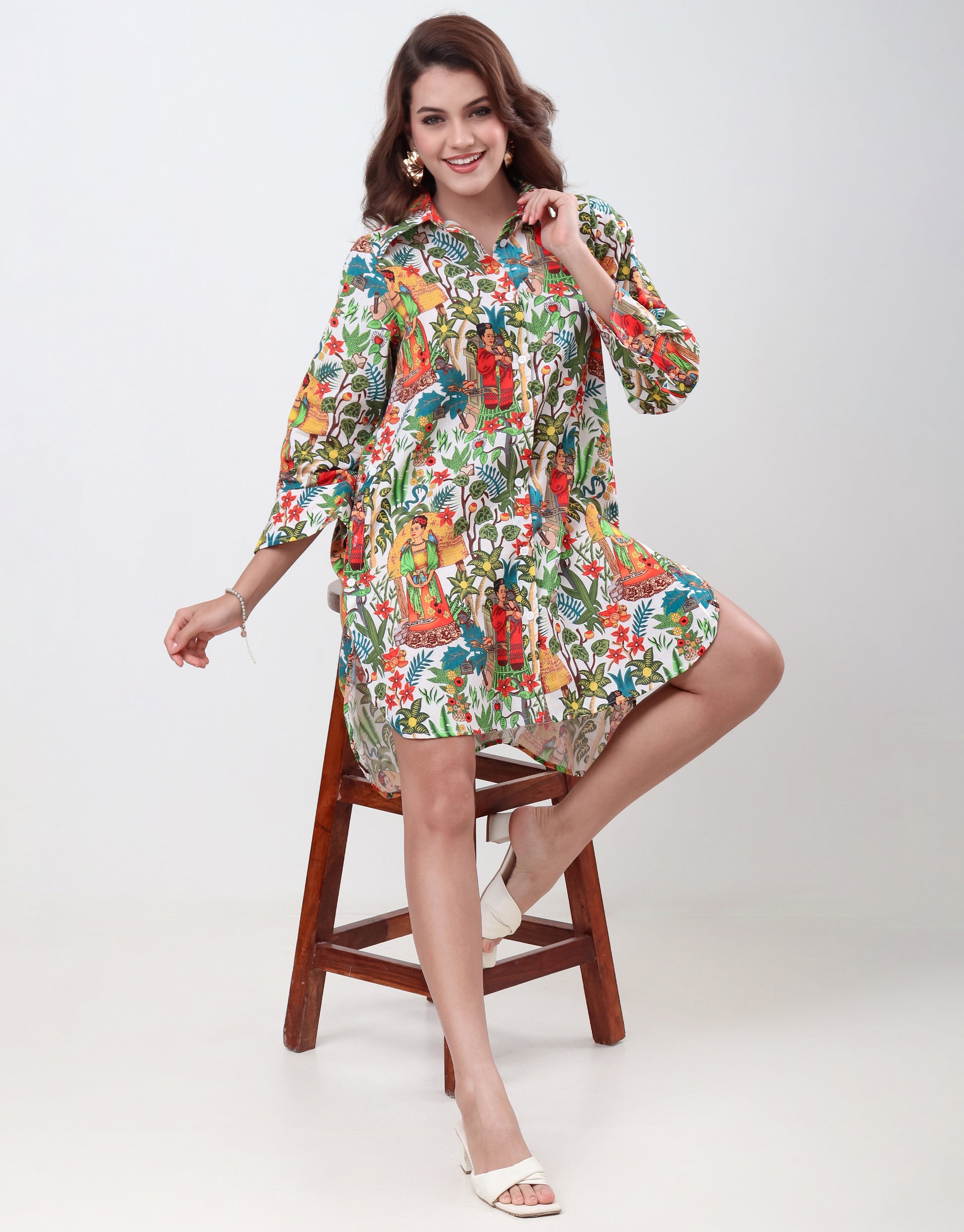 Immerse yourself in a world of art and color with our "Vibrant Folkloric Tunic Dress." This captivating shirt-dress is a true masterpiece, featuring a rich, all-over print of intricate folk-art figures nestled within a lush, tropical jungle of colorful flowers and vibrant green foliage. The design is a celebration of cultural artistry, with a stunning palette of reds, greens, yellows, and blues that bring the scene to life.