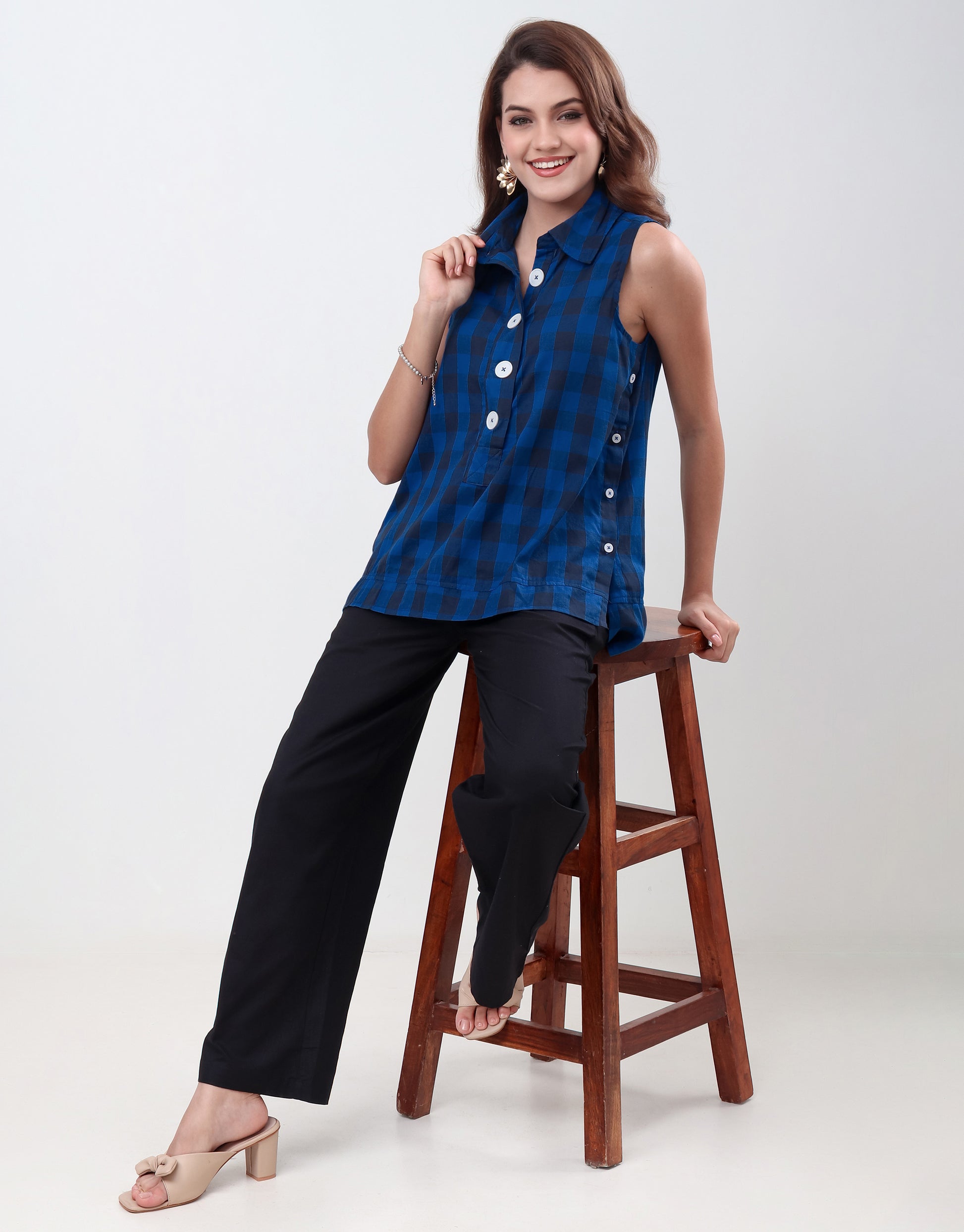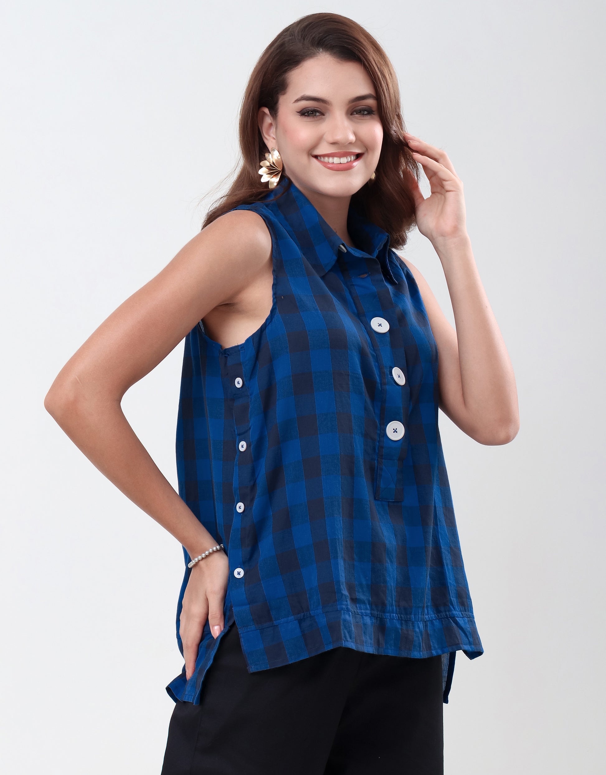 Elevate your casual wardrobe with this striking cobalt and navy buffalo check Azure Pivot top. This sleeveless piece features a crisp, pointed collar and a unique partial button placket with oversized white buttons for a bold, graphic contrast. The standout feature is the functional side-button detailing, which allows for a customizable silhouette and added ventilation, making it as practical as it is stylish. The top has a loose, comfortable silhouette with a straight hemline that offers a flattering drape. This blend of a traditional and rustic pattern makes the top a unique and eye-catching statement piece.