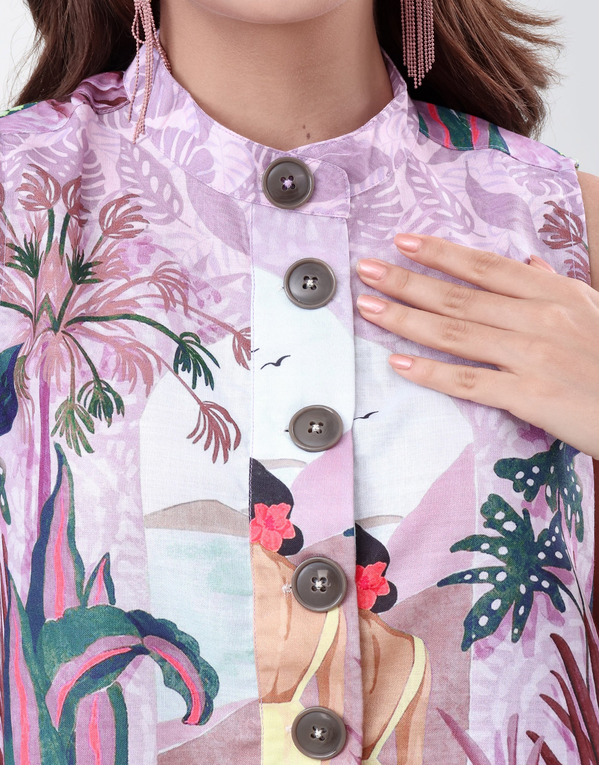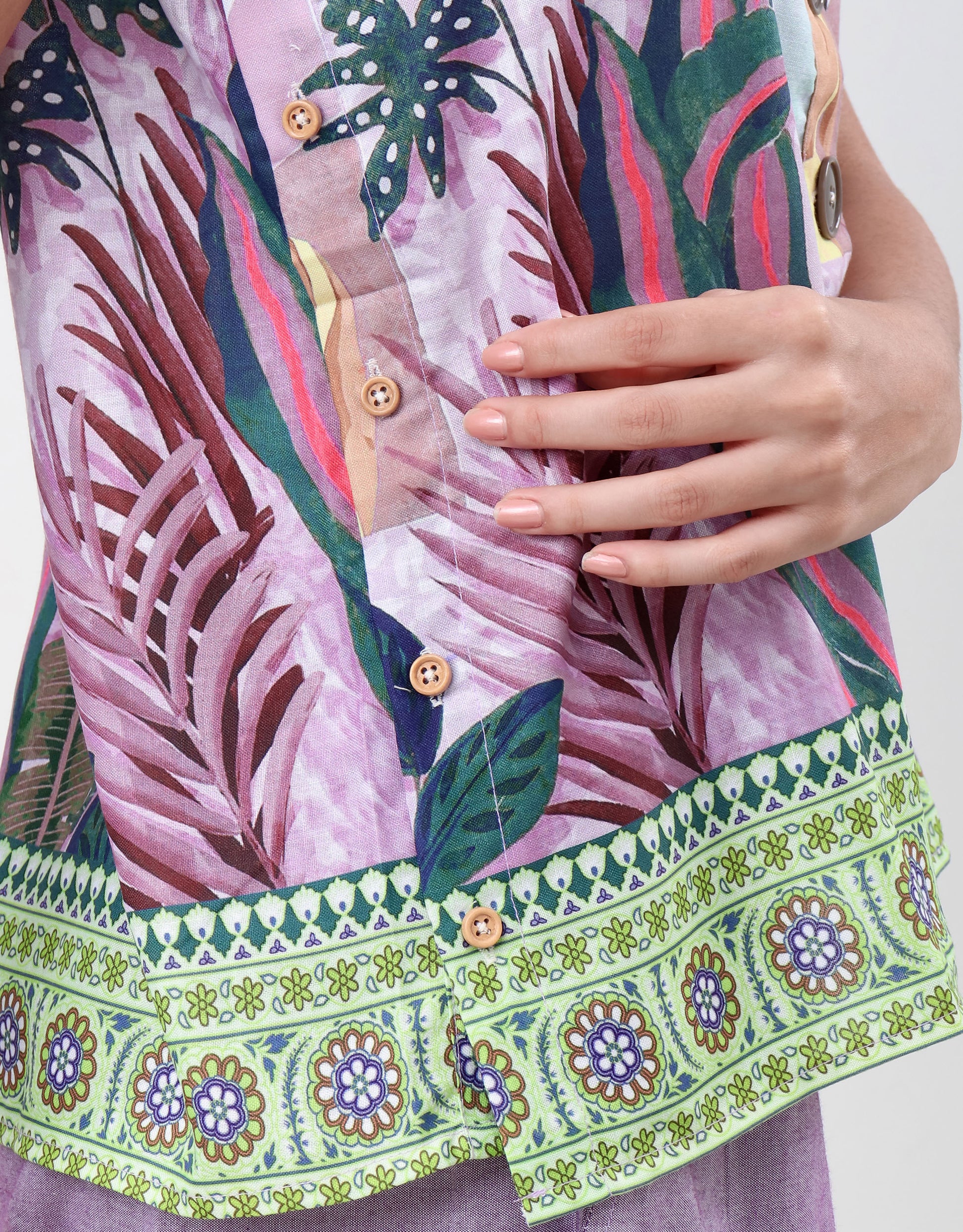 Transport yourself to a tropical paradise with our "Lavender Jungle Print Cotton Blend Sleeveless Top." This luxurious blouse features a dreamy, all-over print of lush jungle foliage, majestic palm trees, and subtle hints of wildlife in a soothing palette of lavender, dusty rose, deep greens, and navy. The lightweight cotton blend fabric drapes beautifully and feels incredibly soft against the skin, offering both comfort and elegance.