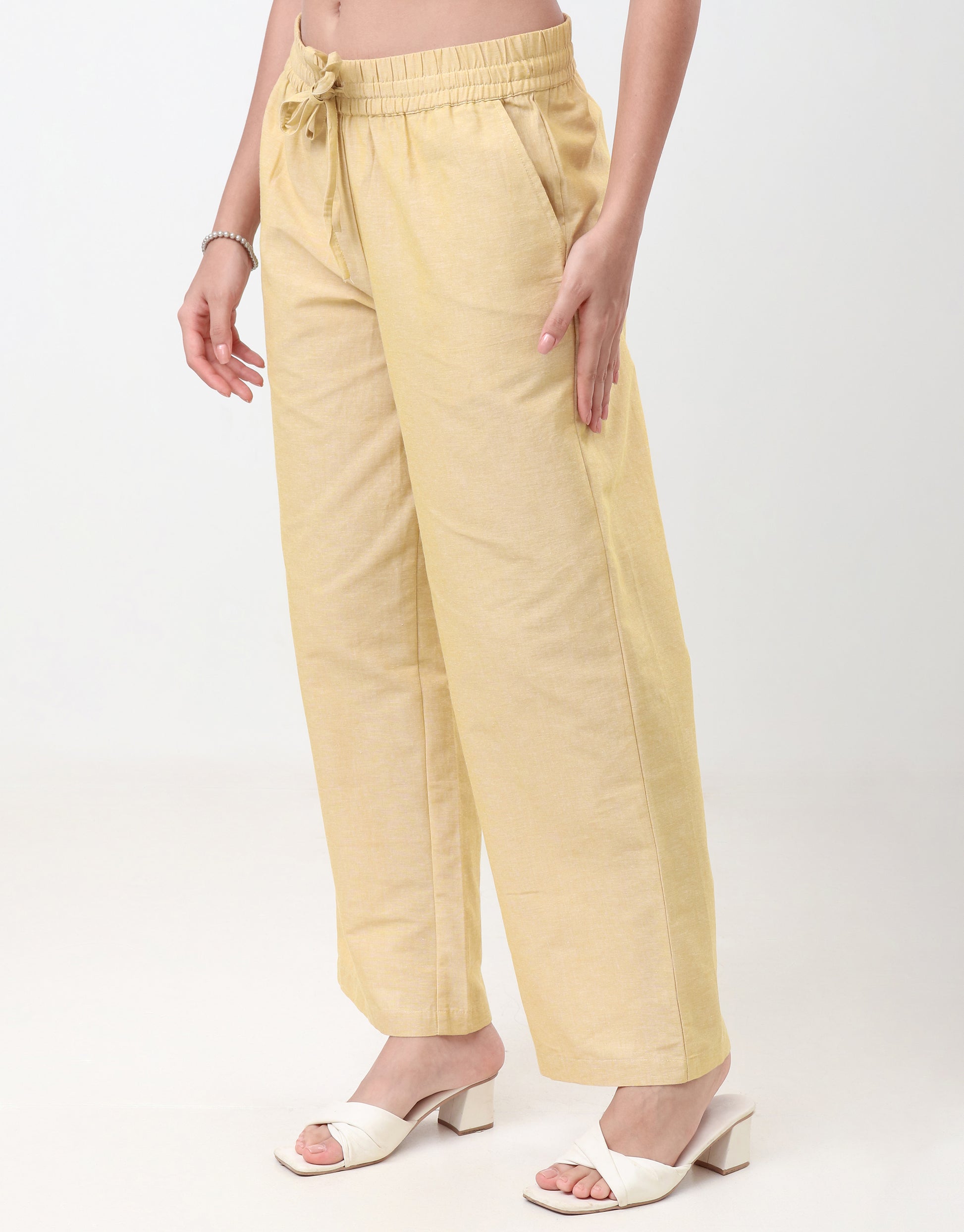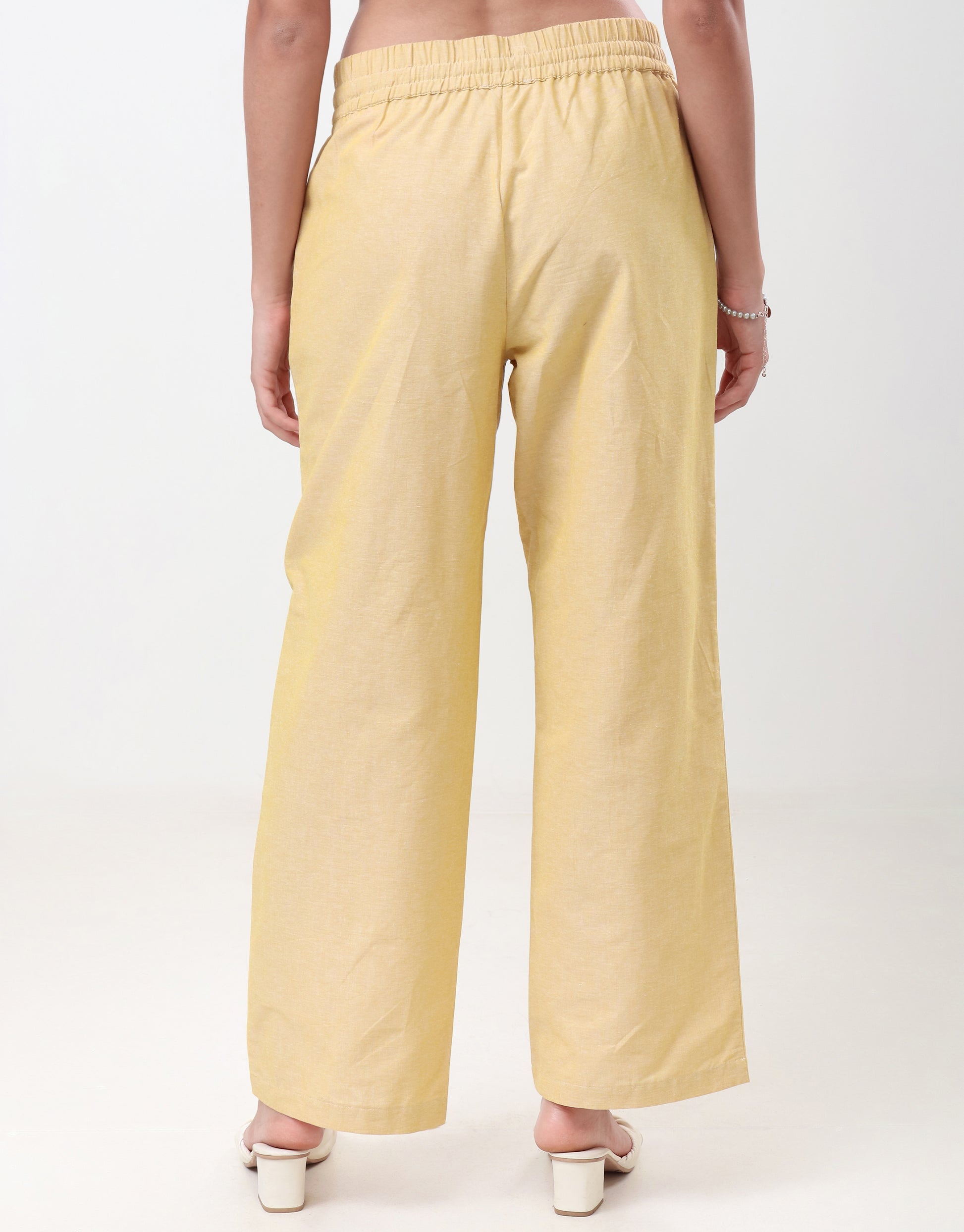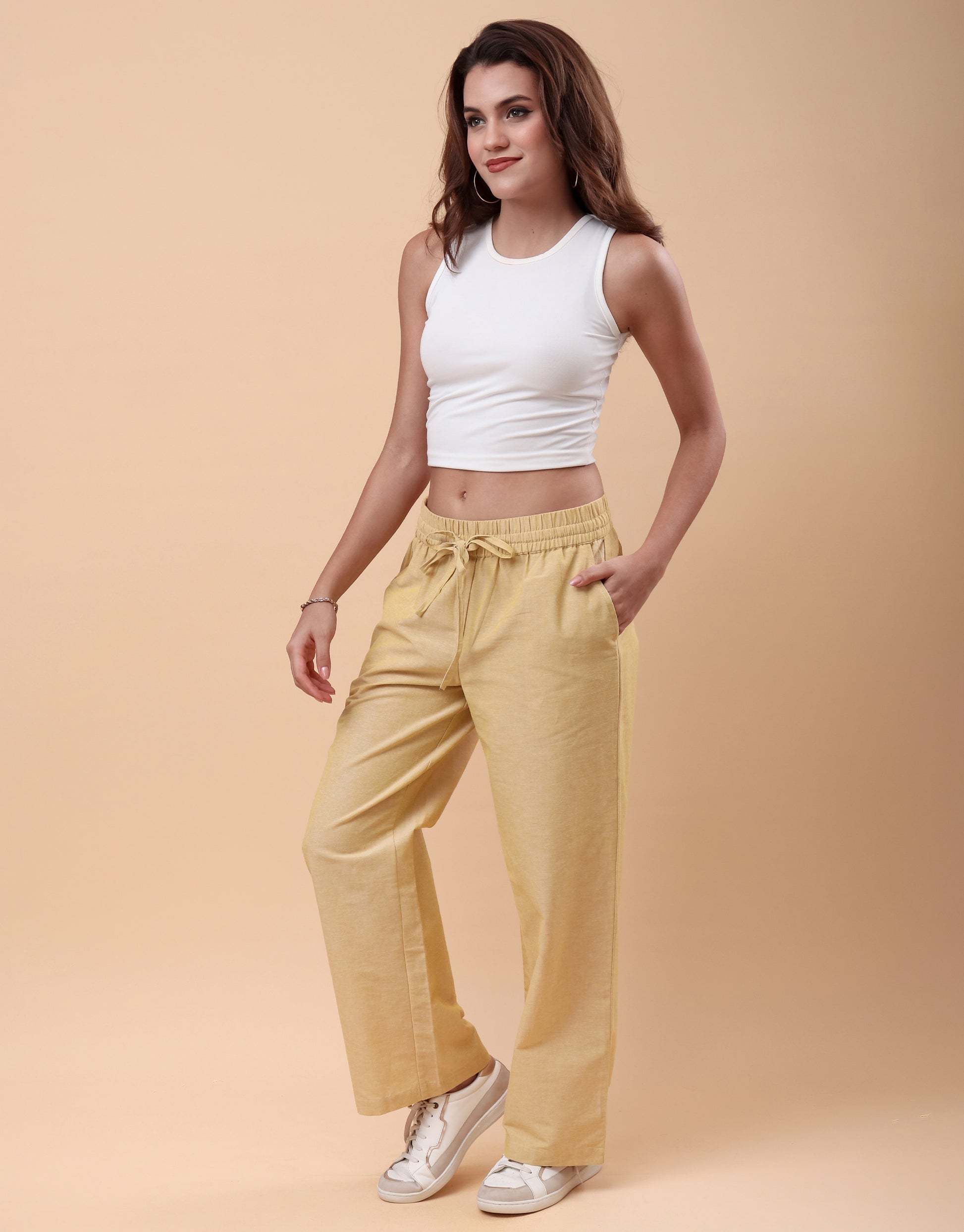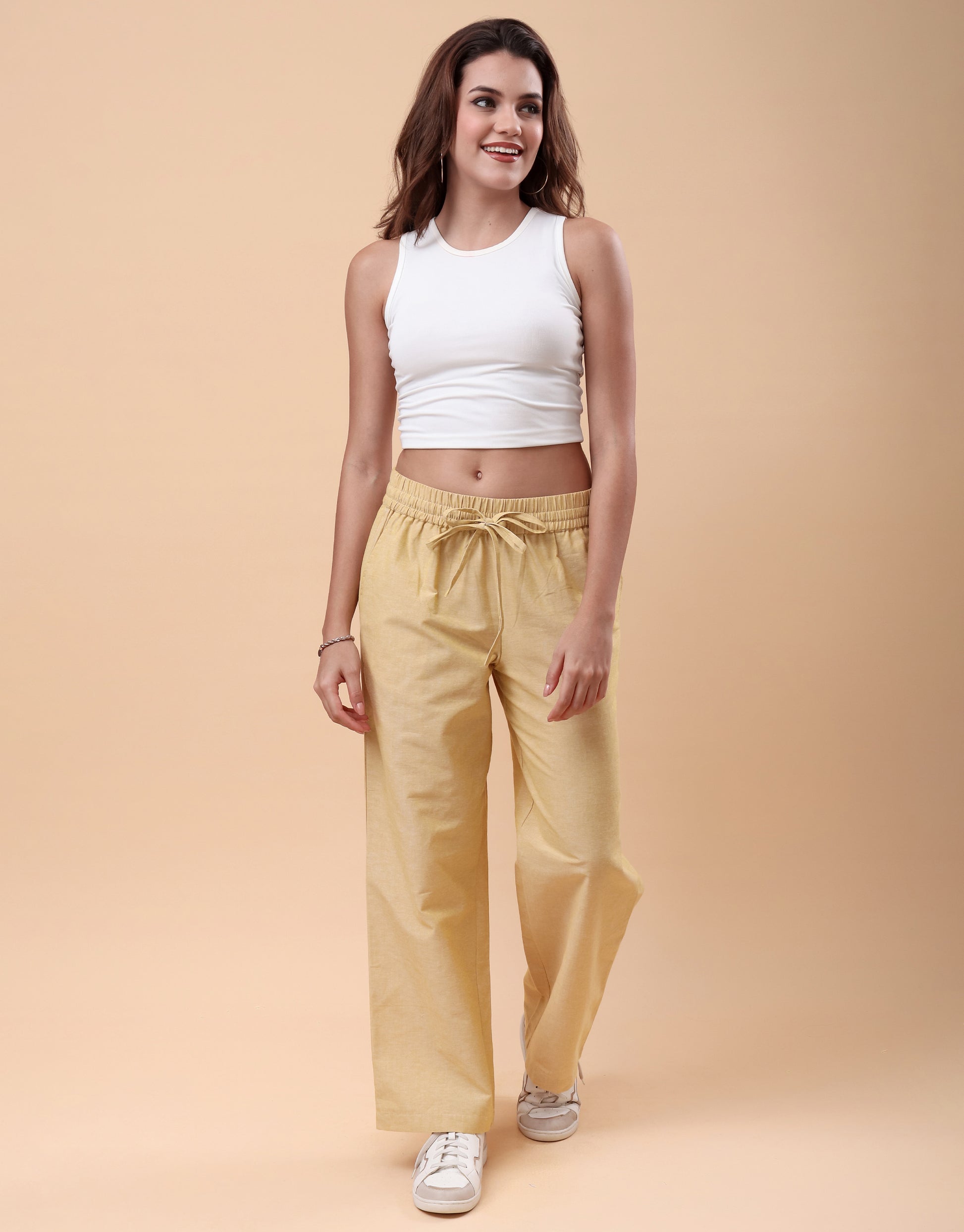 Discover the perfect blend of comfort and style with our "Luxe Comfort Pure Cotton Trousers." These versatile trousers are crafted from 100% premium cotton, offering exceptional breathability and a soft, lightweight feel that's perfect for all-day wear. The relaxed, wide-leg silhouette provides a modern, on-trend look, while the elasticized drawstring waist ensures a comfortable and adjustable fit. In a sophisticated soft yellow tone, these trousers are a wardrobe essential that can be effortlessly paired with a simple tee for a casual day out or dressed up with a blouse for a more polished ensemble. Elevate your everyday style with these must-have, pure cotton pants.