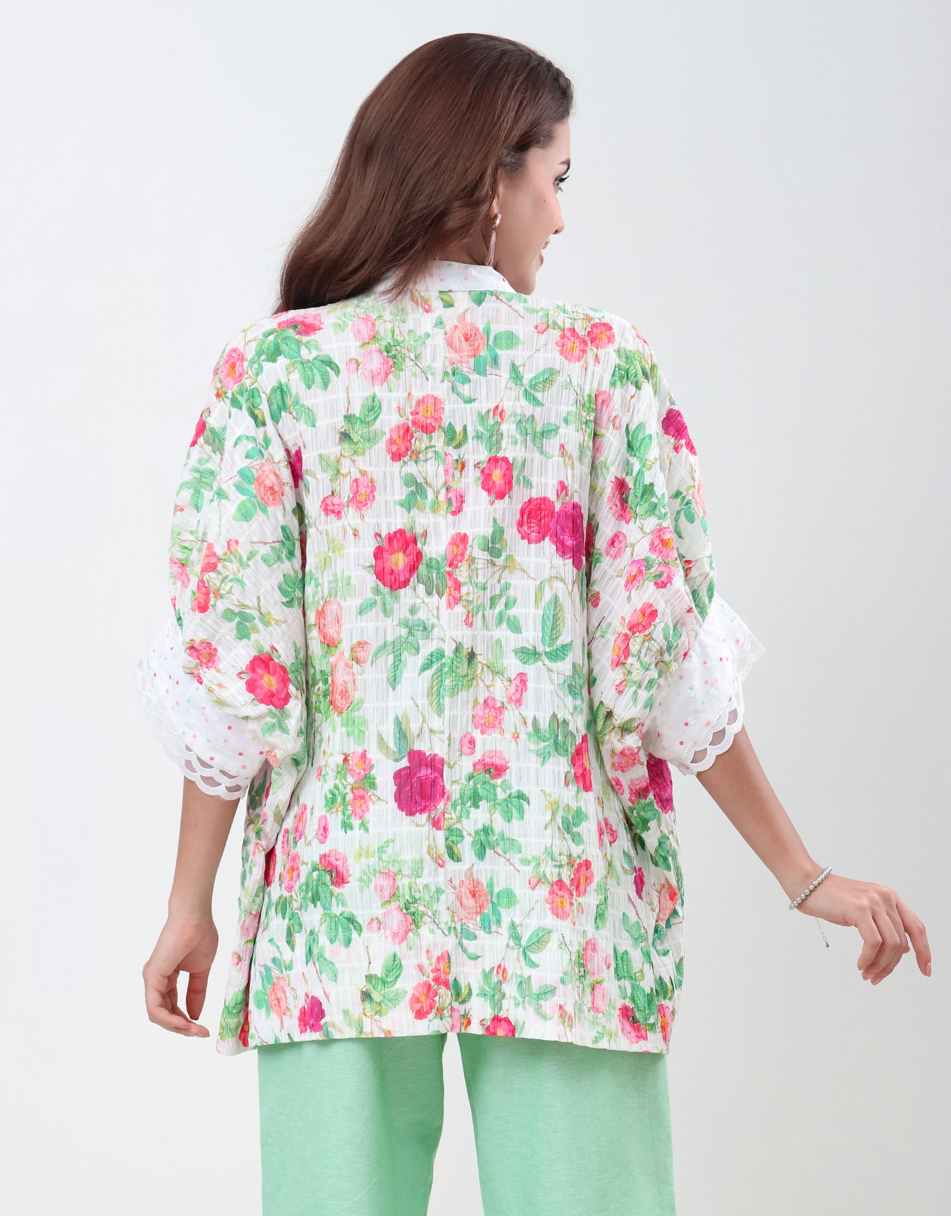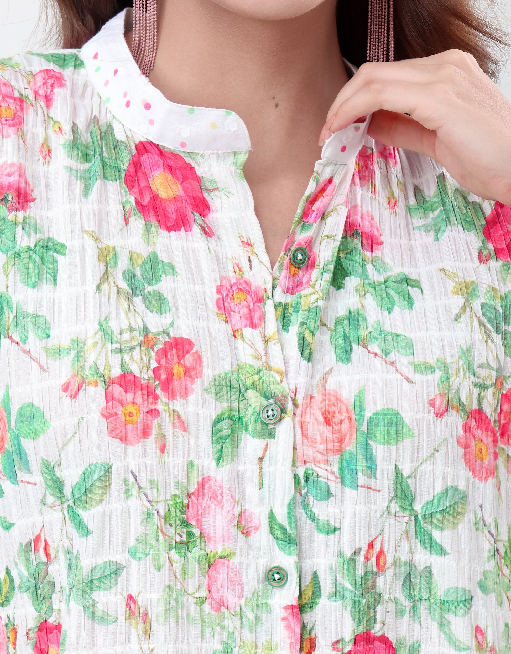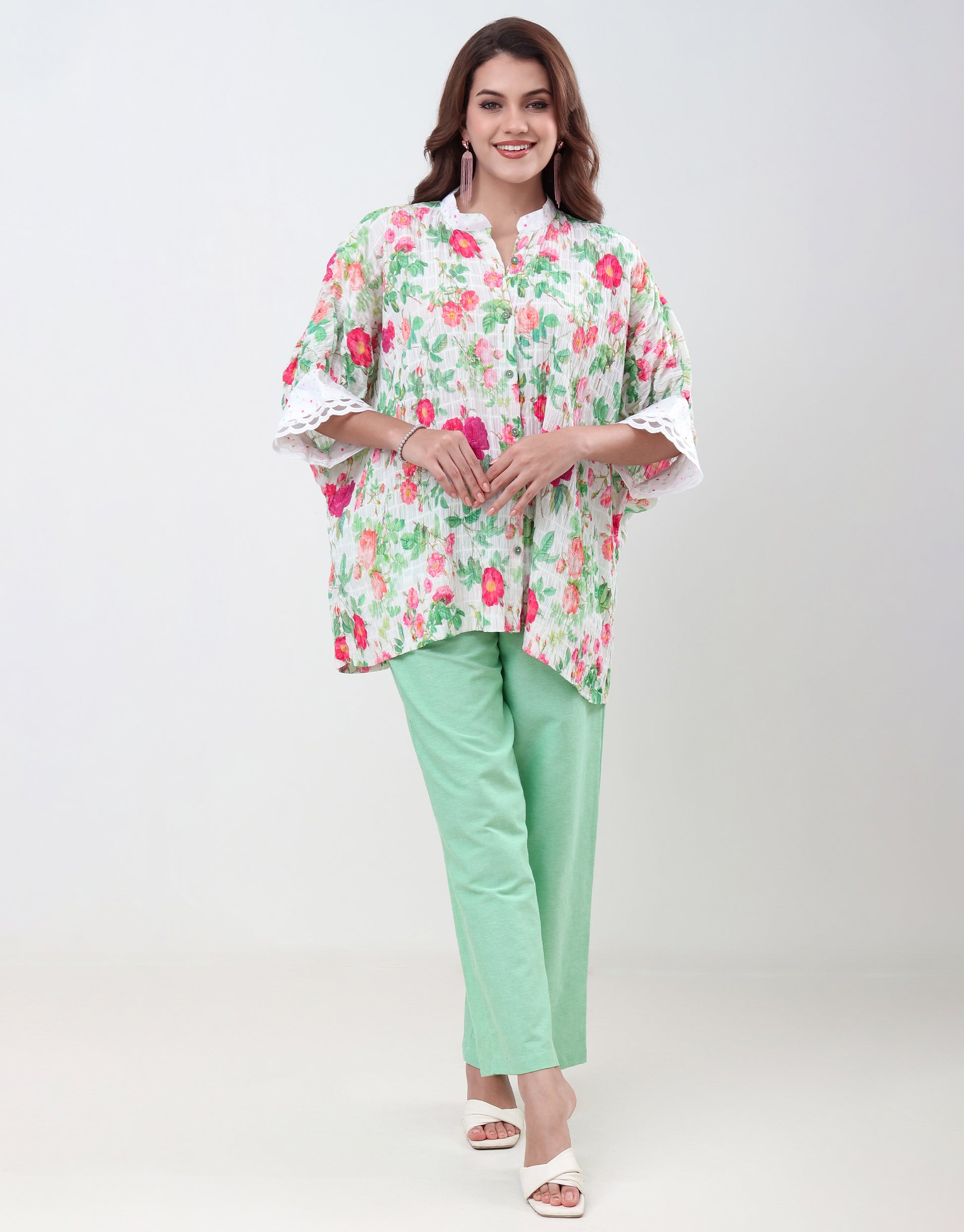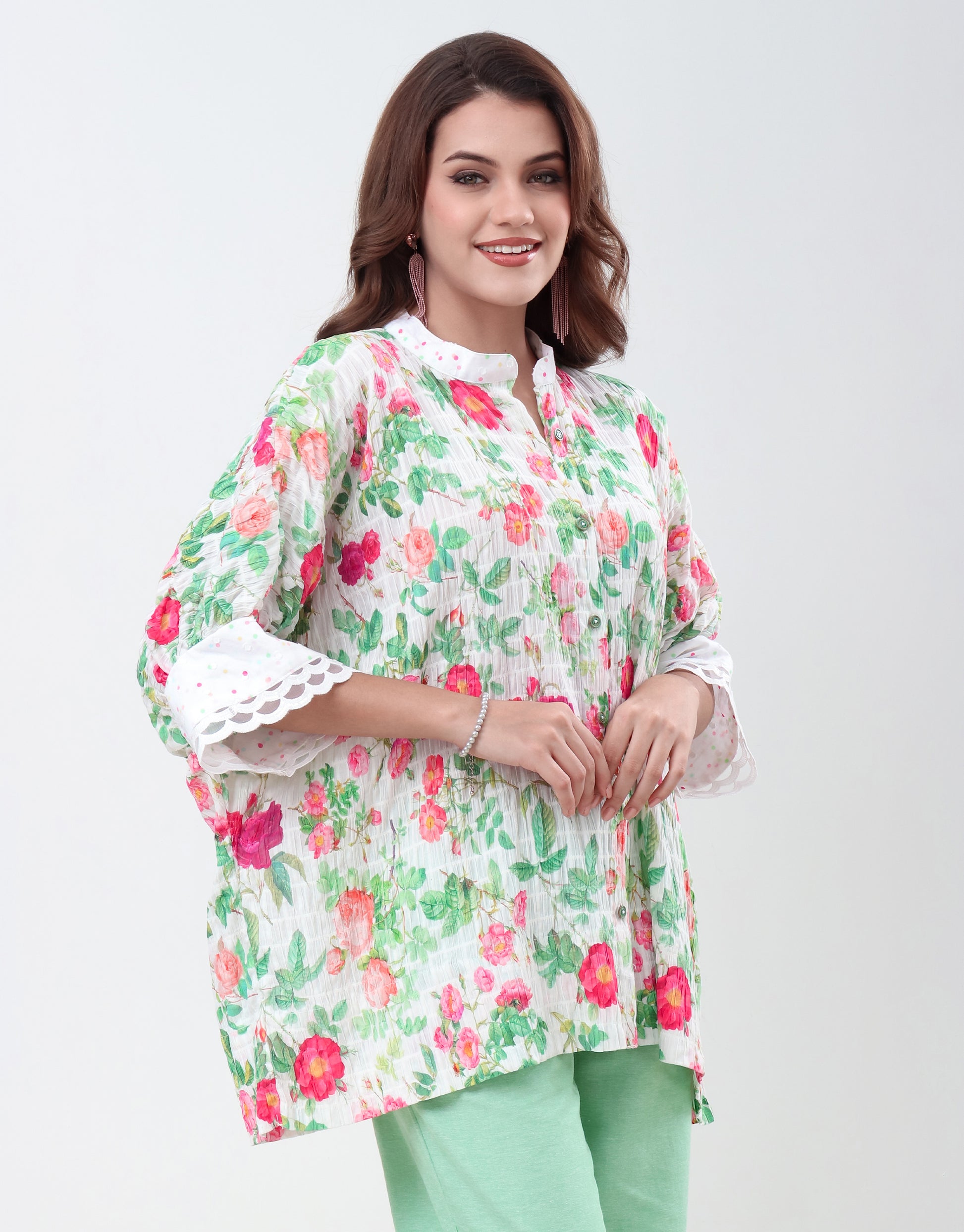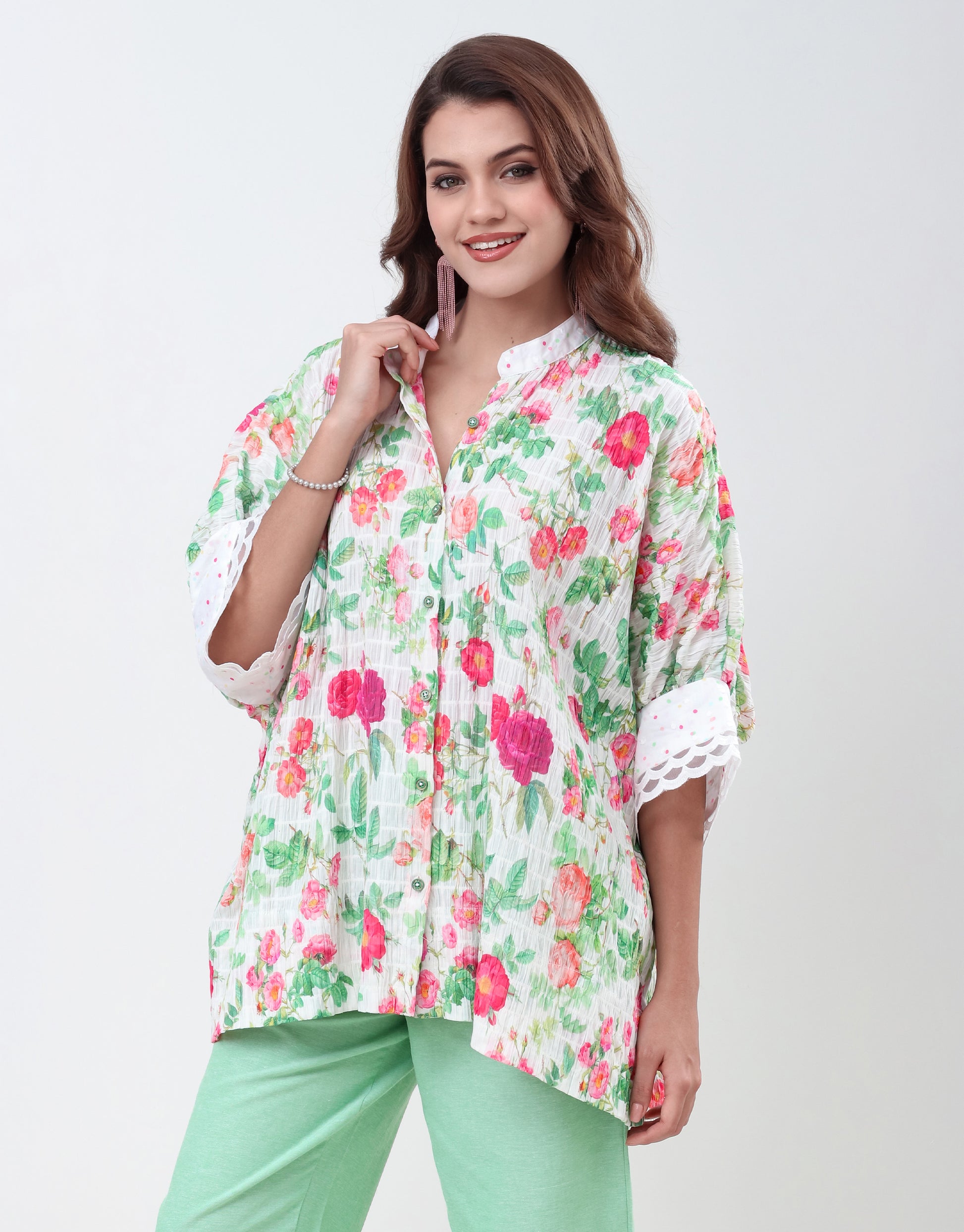 Elevate your wardrobe with this exquisite floral-print shirt, a perfect blend of modern style and timeless elegance. Crafted from a lightweight, breathable cotton fabric, this loose-fitting top drapes beautifully for a comfortable yet sophisticated silhouette. The vibrant floral pattern, featuring a delightful mix of red, orange, and green hues against a crisp white background, brings a fresh and lively feel to any occasion.
