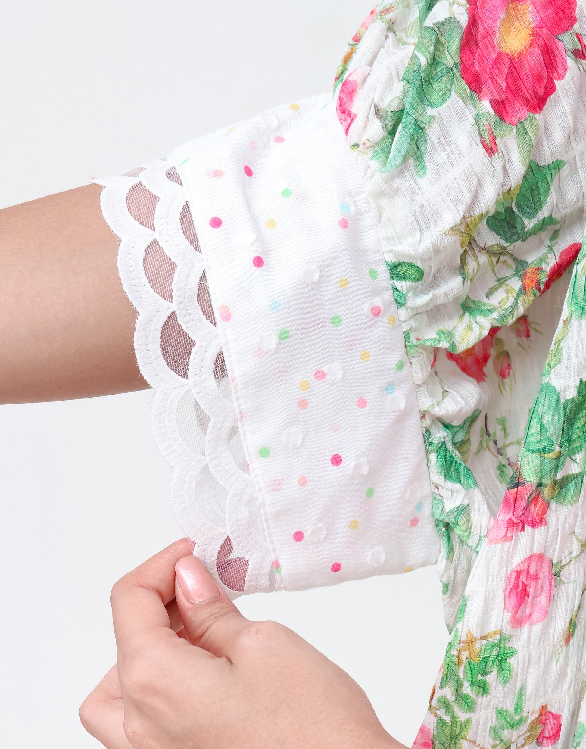 - Lace Trim Detailing: The cuffs are adorned with a wide, delicate white lace trim, adding a touch of elegance and texture.
