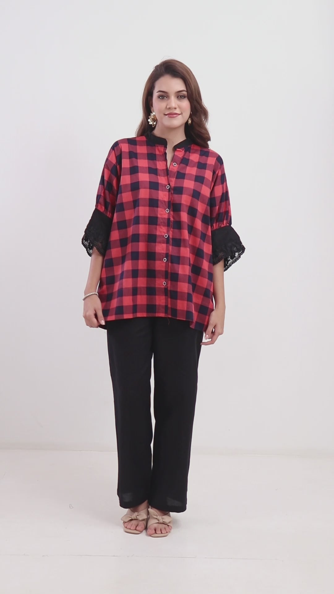 Canyon Check is a stylish and relaxed-fit smock-style top featuring a bold, classic dark peach and black buffalo check or gingham pattern. The shirt has a loose, comfortable silhouette with a straight hemline that offers a flattering drape. A key design element is the contrasting black detailing; the mandarin-style collar is a solid black, and the sleeves are adorned with intricate black lace. The sleeves are wide and cropped, ending in a double-tiered ruffle of delicate black lace, adding a touch of romance and dramatic flair to the classic plaid. This blend of a traditional, rustic pattern with feminine, lacy details makes the shirt a unique and eye-catching statement piece.