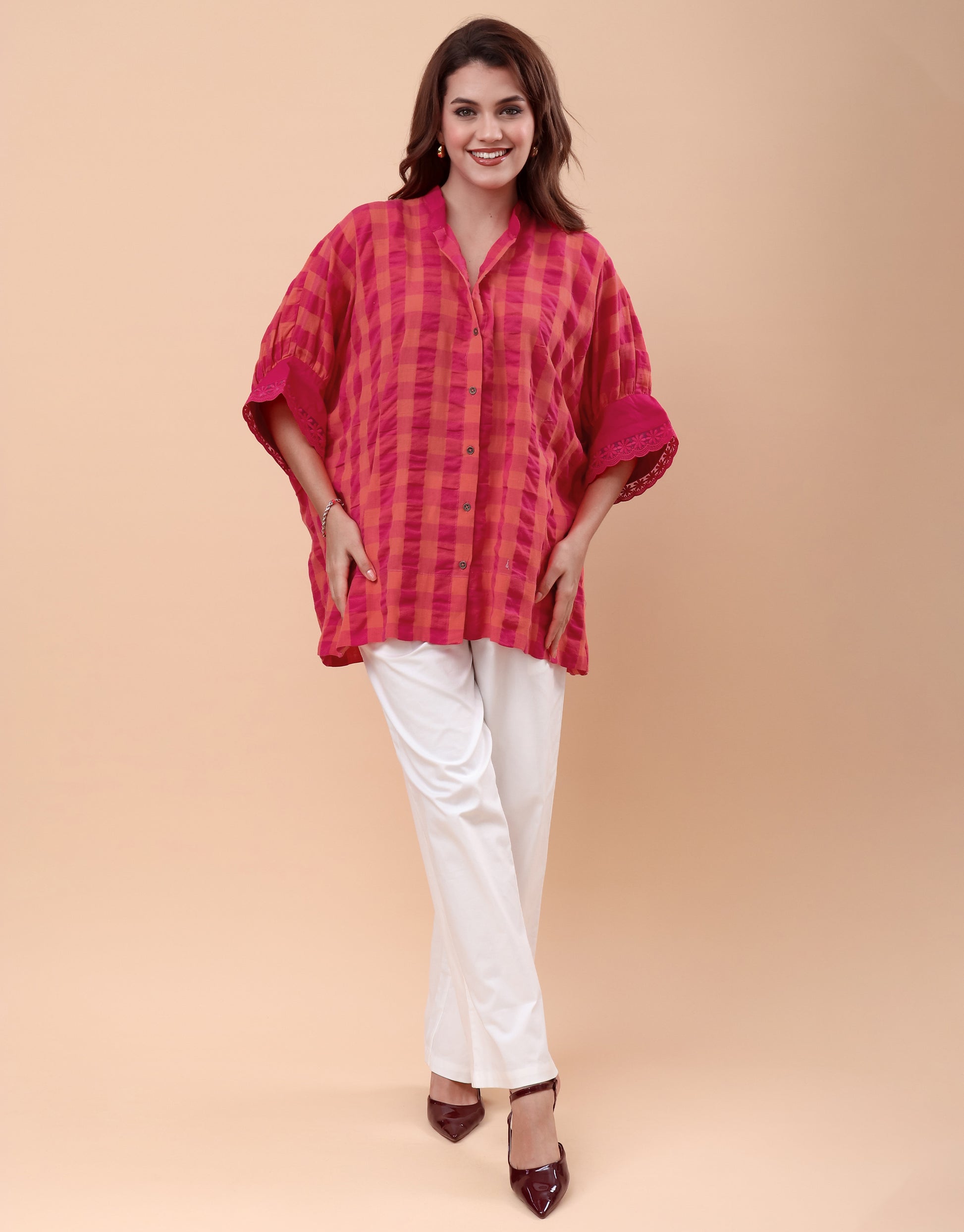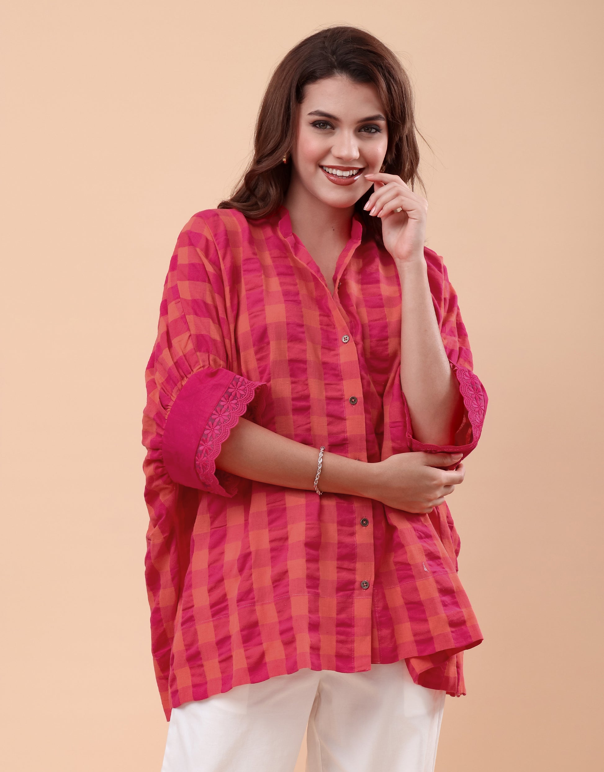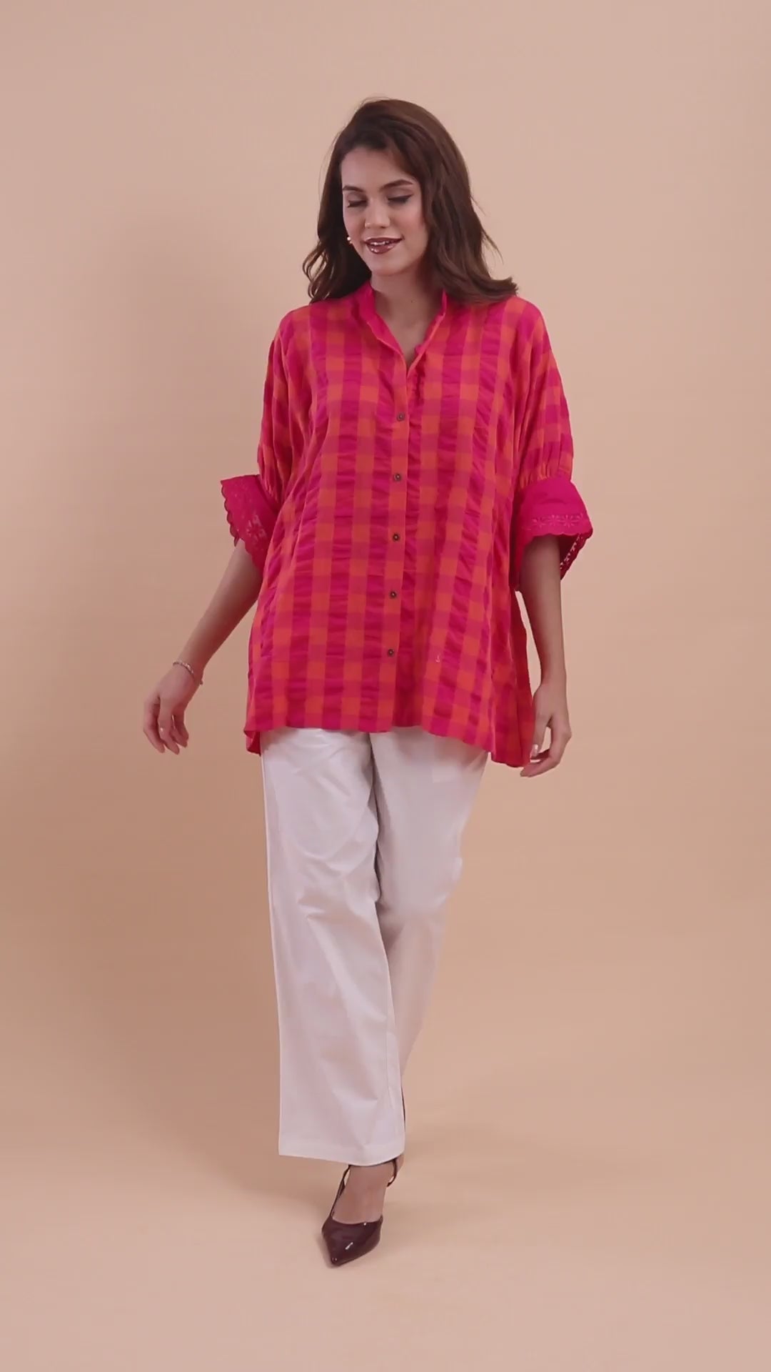 Sunset pop is a stylish and relaxed-fit smock-style top featuring a vibrant, classic fuchsia and orange plaid or gingham pattern. The shirt has a loose, comfortable silhouette with a straight hemline that offers a flattering drape. A key design element is the contrasting detailing; the mandarin-style collar and the wide, voluminous sleeves are in a solid fuchsia fabric. The sleeves have a decorative cuff with intricate white embroidered lace, adding a touch of delicate, feminine flair to the bold print. This blend of a traditional plaid with playful and refined details makes the shirt a unique and eye-catching statement piece.