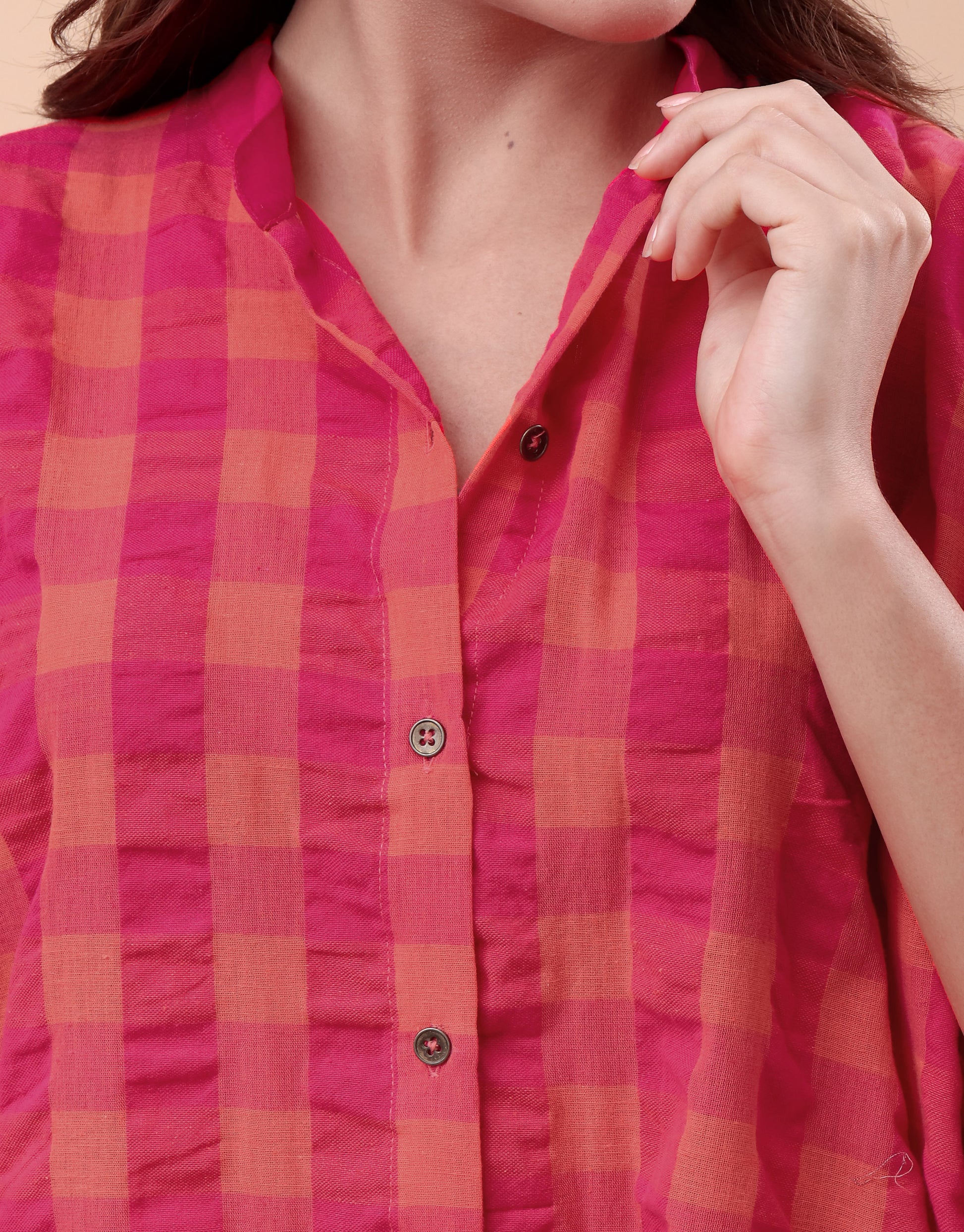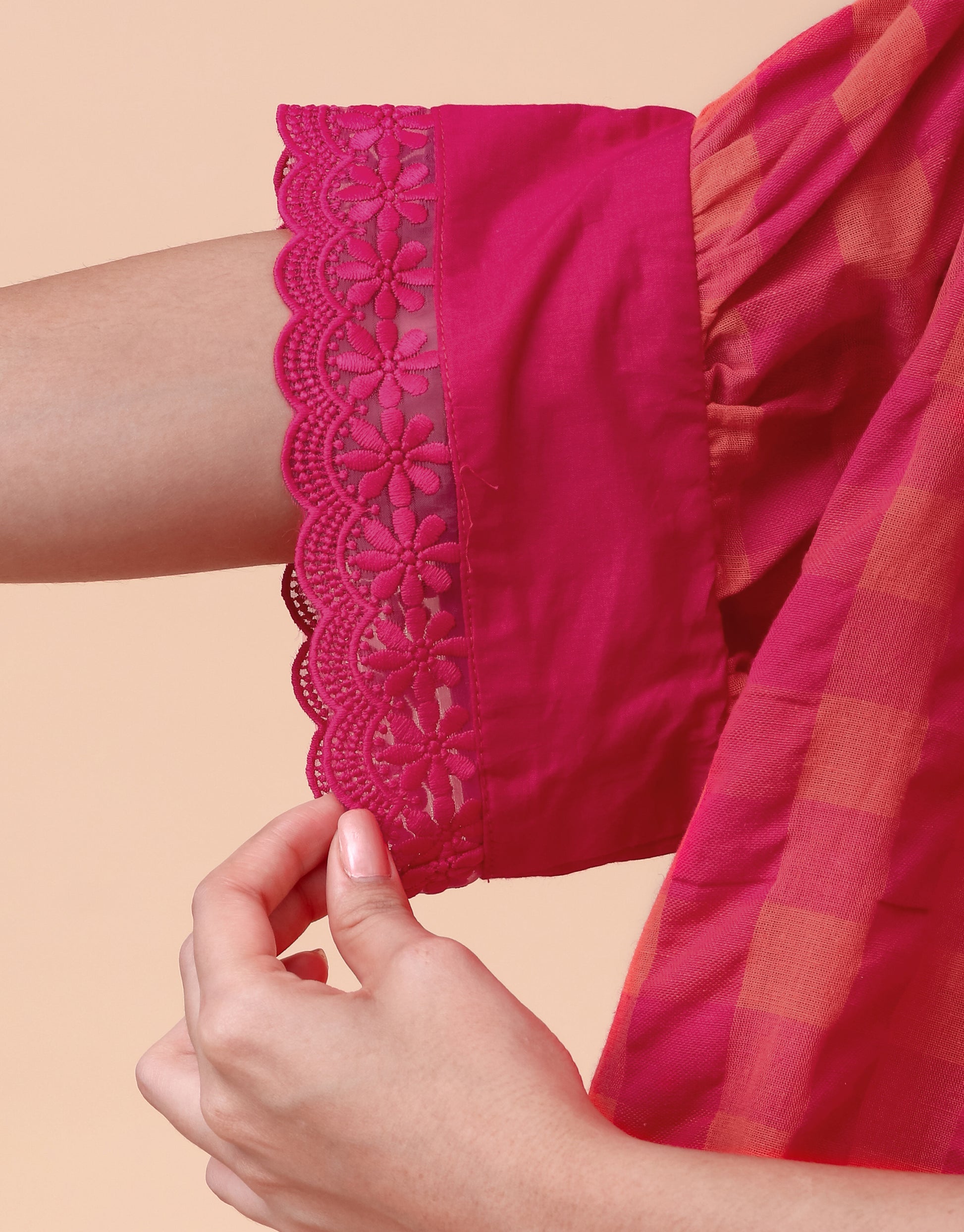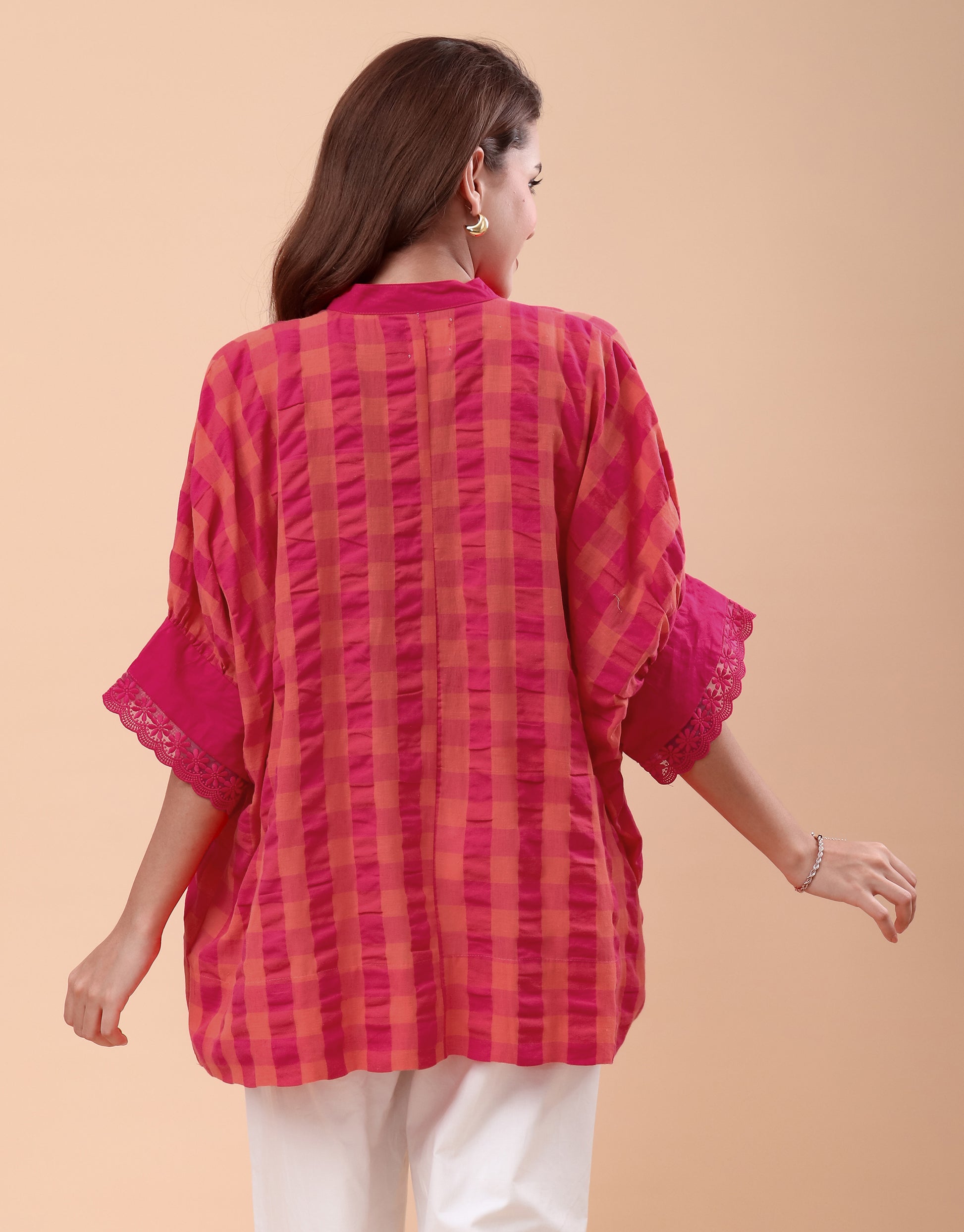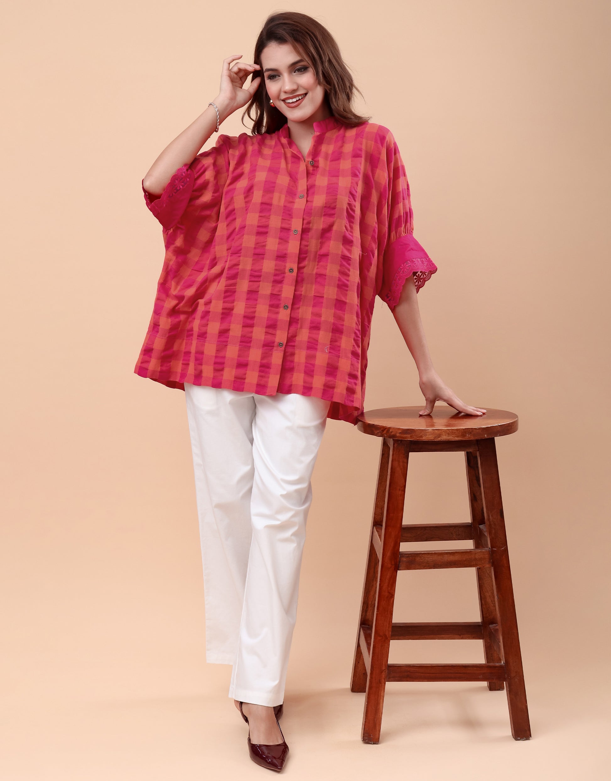 Sunset pop is a stylish and relaxed-fit smock-style top featuring a vibrant, classic fuchsia and orange plaid or gingham pattern. The shirt has a loose, comfortable silhouette with a straight hemline that offers a flattering drape. A key design element is the contrasting detailing; the mandarin-style collar and the wide, voluminous sleeves are in a solid fuchsia fabric. The sleeves have a decorative cuff with intricate white embroidered lace, adding a touch of delicate, feminine flair to the bold print. This blend of a traditional plaid with playful and refined details makes the shirt a unique and eye-catching statement piece.