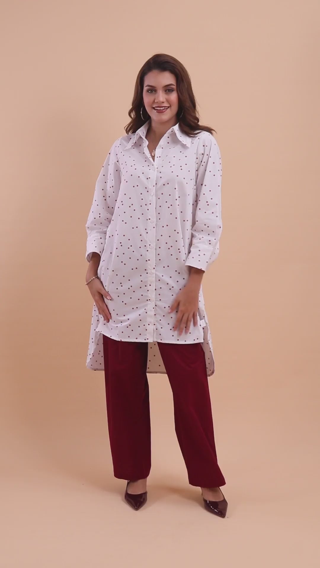 Discover a fusion of art and fashion with our Polka Dot Long Shirt paired with maroon trousers to complete the look. The white, elegant long button-down shirt is a true statement piece, featuring an all-over abstract polka dot print.