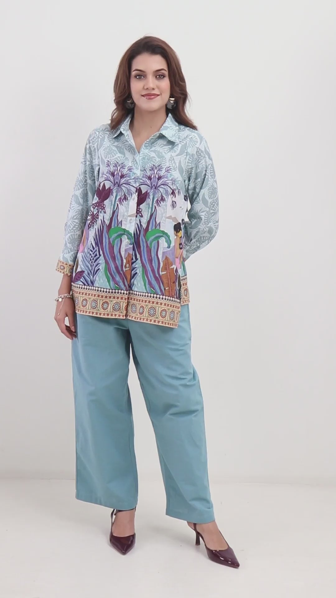 Step into a world of artistic expression with our Oceanic Oasis Printed Shirt paired with teal trousers to complete the look. This captivating button-down shirt is a true wearable work of art, featuring a unique and intricate multi-toned blue and teal print inspired by a serene ocean scene. The design showcases palm trees, crashing waves, and abstract figures, creating a truly one-of-a-kind look. A beautifully detailed, patterned border runs along the hem and sleeve cuffs, adding an elegant and bohemian touch. Crafted from a lightweight, fluid cotton fabric, this shirt drapes beautifully for a relaxed yet refined fit. Perfect for making a statement, this piece is a must-have for the fashion-forward individual who appreciates unique and artistic style.